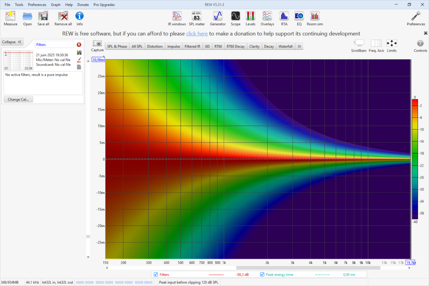 Au point d'écoute, avec le spectrogramme au 1/3 d'octave, si j'arrive à ça ce sera beau (on voit tout : amplitude rouge de la même couleur et peak energy time symétrique à 0ms = délai de groupe). Quand la courbe de phase est linéaire à 0° de 20hz à 20khz, on a le DG à 0ms de 20hz à 20khz :