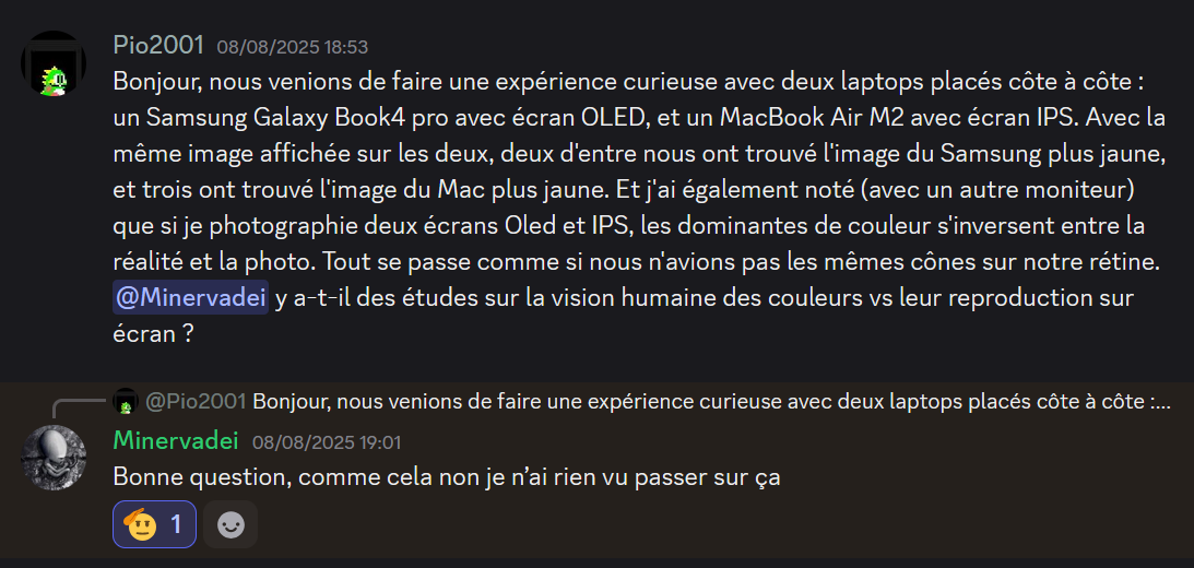 Je note que l'observation a été faite en juxtaposant deux dalles de spectres différents (oled vs LCD). Si l'explication est là, c'est assez effrayant pour tout le métier de la calibration.