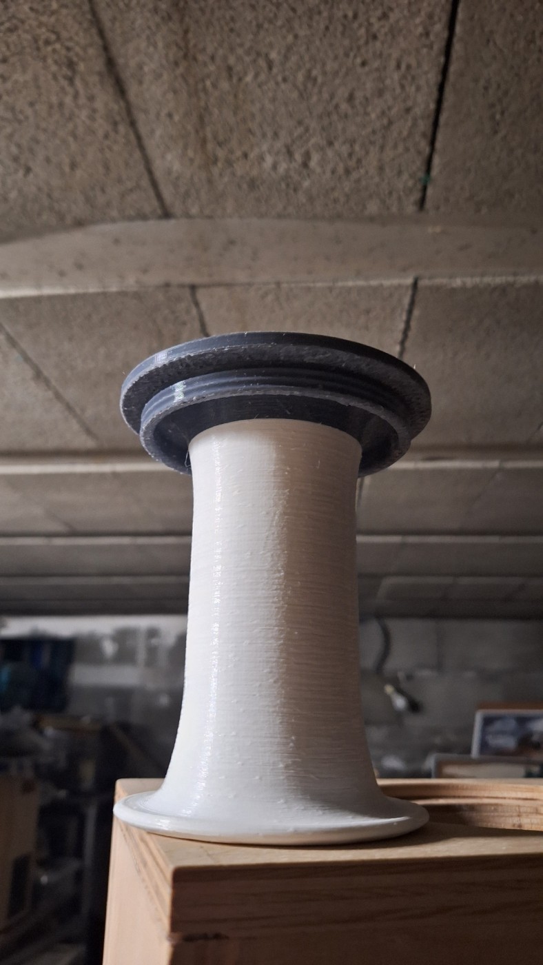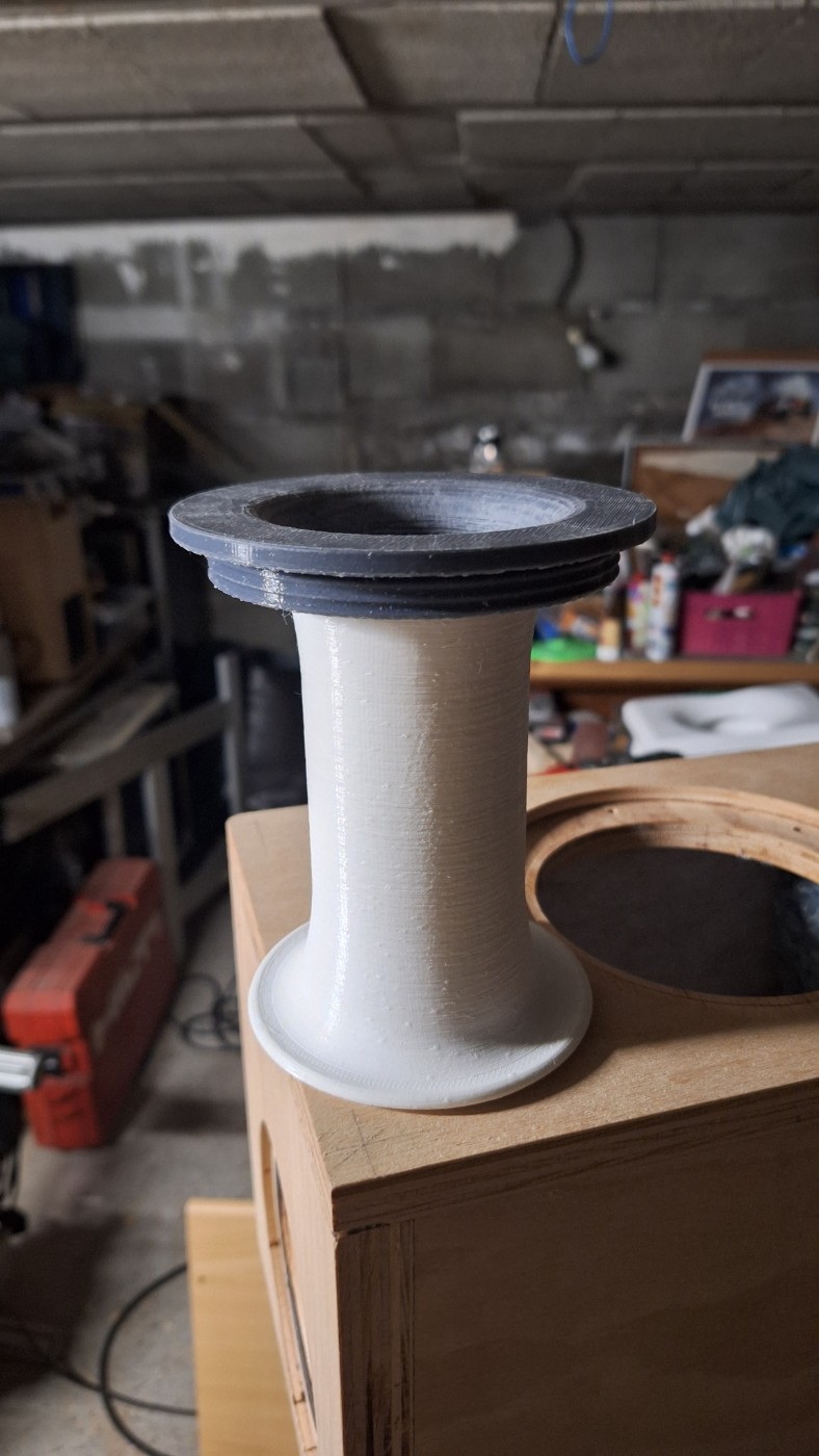 J'ai imprimé l'évent définitif (le format définitif, le vrai évent sera confié a Xometry), démonté le HP, faut maintenant finir la caisse : rayonnages, reprise du trou central de l'évent (il ne passe plus la, en monobloc) et après, ça repart.