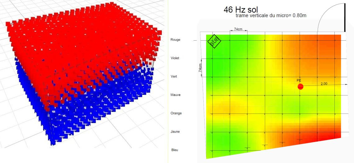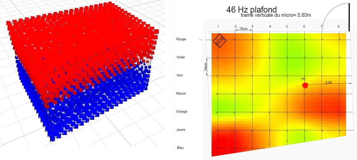 Le micro est positionné aux angles virtuels de parallélépipèdes de 74cm x 74cm x 0.80cm et est déplacé d’angle en angle virtuels pour cumuler les 220 mesures environs.