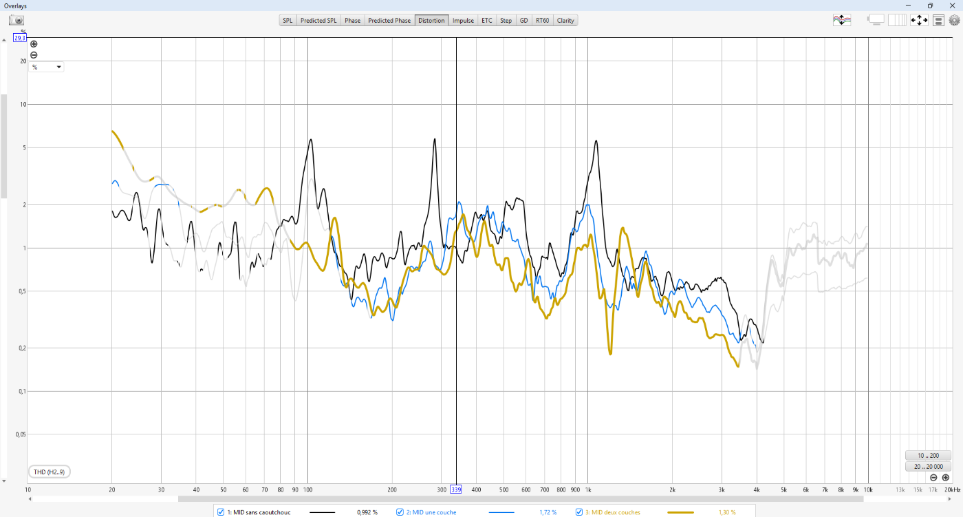 La première, j'avais une "résonnance" désagréable à l'écoute que je n'arrivais pas à identifier à la mesure mais qui se situait dans la bande 150-300Hz sur mon DEQ2496. Certes, j'ai fait également évoluer ma méthode d'égalisation que j'effectue en 1/12 d'octave au lieu de 1/3 pour que REW ne corrige pas les défauts supérieurs à 6dB. Est-ce un effet conjugé ? je ne sais pas répondre.