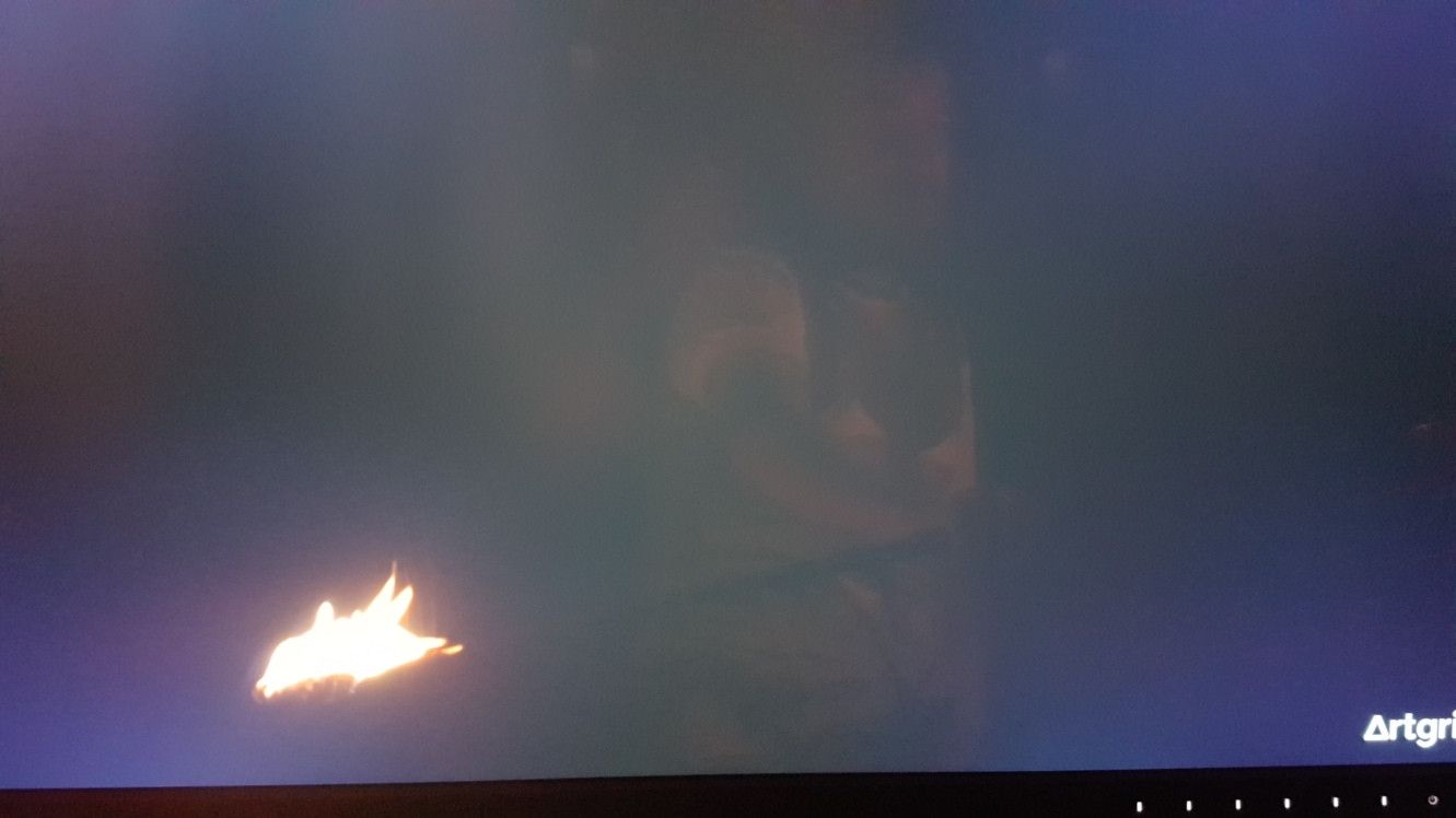 En vrai, je distingue à peine la barre verticale dans le dos du personnage. Je peux deviner ses cheveux si je masque la flamme qui m'éblouit. Je vois par contre que le fond de l'image n'est pas noir. La dalle n'est pas complètement éteinte,ça se voit très facilement.