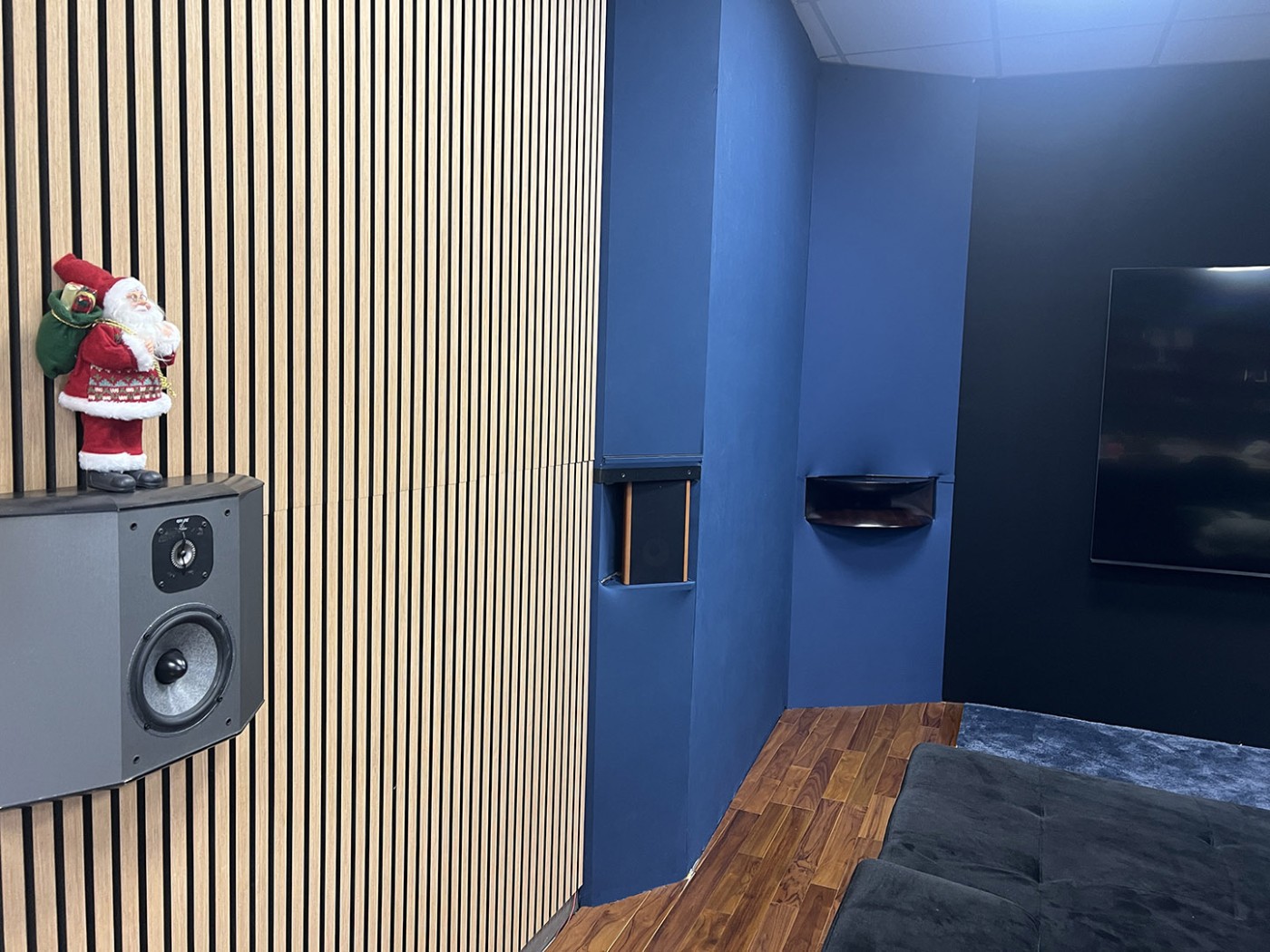 Le but étant d’être symétrique sur les 4 premiers mètres en terme de traitements pour la gestion des premières réflexions. Traitement, qui se trouve derrière le tissu acoustique tendu bleu.