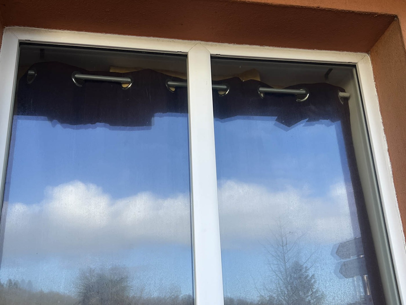Rideaux sur vitres double vitrage pour la partie droite derrière les rideaux bleus;