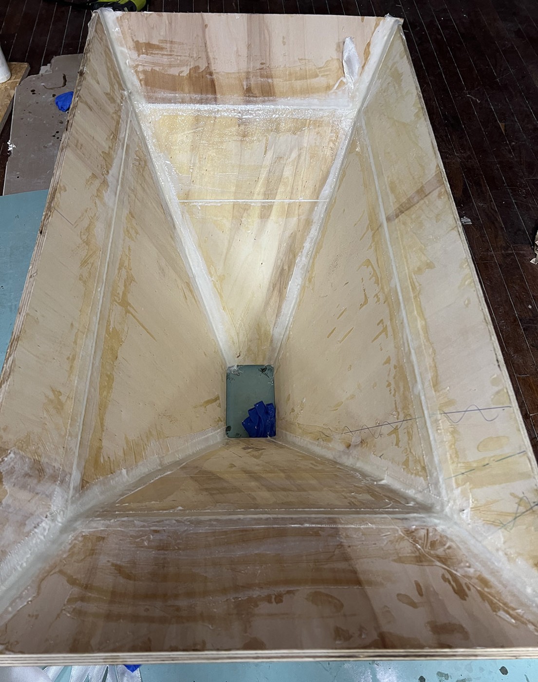 Puis voici le collage par joins congés époxy (résine époxy chargée au Woodfill, puis stratification de bandes de fibres de verre), montage rapide et très compact, 24H de polymérisation (durcisseur à prise médium)