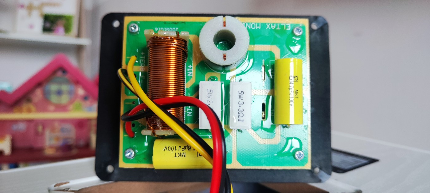 A gauche sur l'image c'est bien le filtre RLC pour l'aigu (fil rouge)