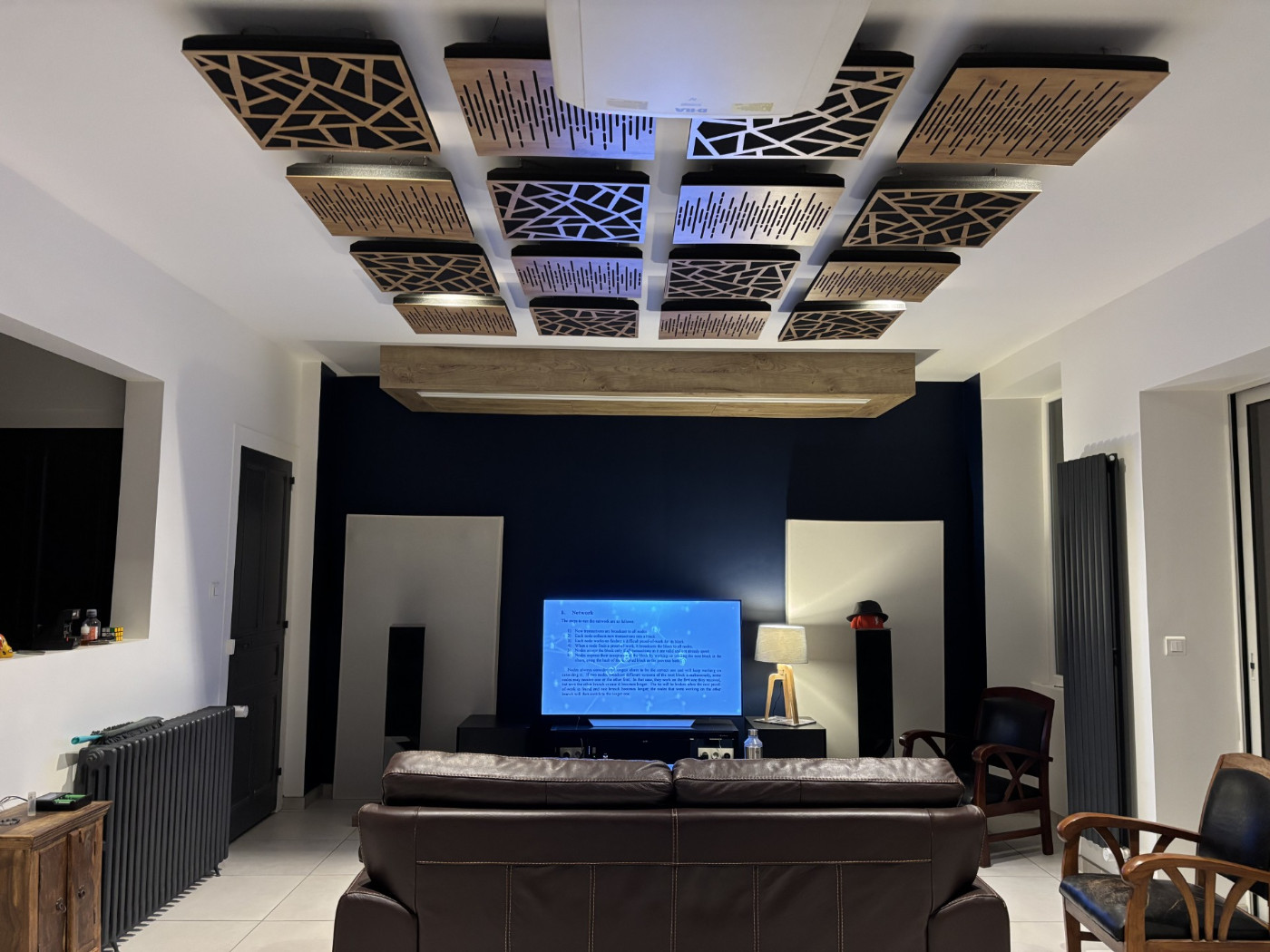 Voulant réduire la forte réverbération présente dans mon salon, qui nuit à la qualité de restitution sonore et à la qualité de vie quand il y du monde à la maison. Je voulais à la base partir sur du basotect et fabriquer des cadres en bois pour l'esthétique, mais finalement en faisant le compte basotect + bois + système de suspension au plafond + temps de fabrication, je me suis finalement tourné vers ce produit : https://ua-acoustics.com/ceiling-acoust ... ve-ceiling