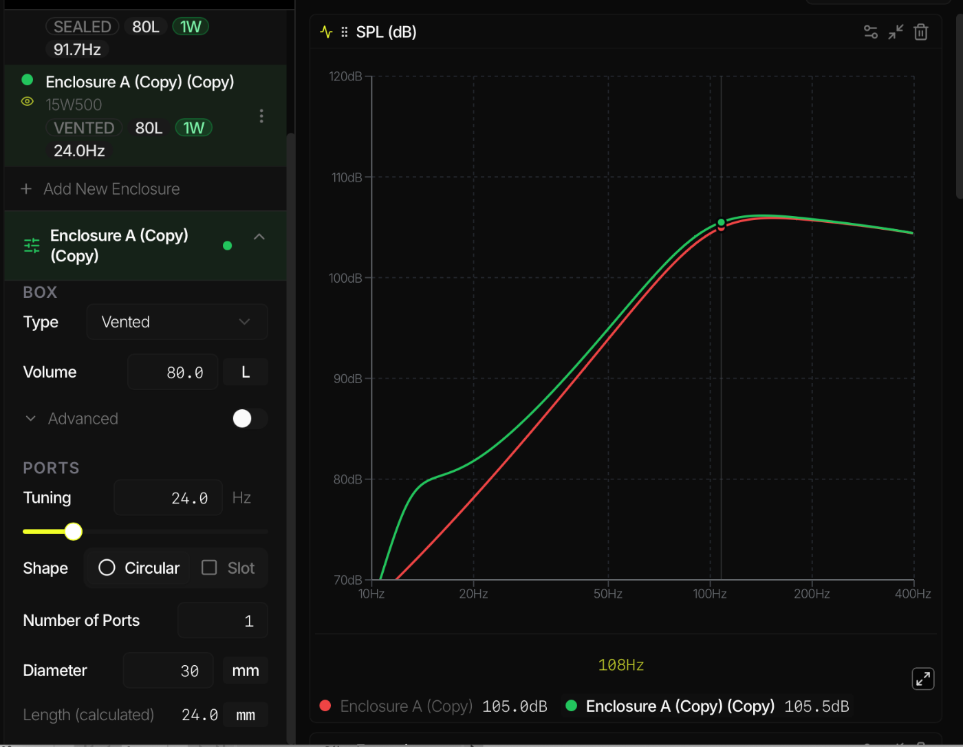 Je suppose que c'est également le cas pur le HP. En étant centré sur la largeur de la face avant, il va de soit qu'il sera surtout impacté par l'onde liée à la profondeur. Comme ici elle est assez haute en fréquence, il sera simple de l'amortir avec de l'amortissant.