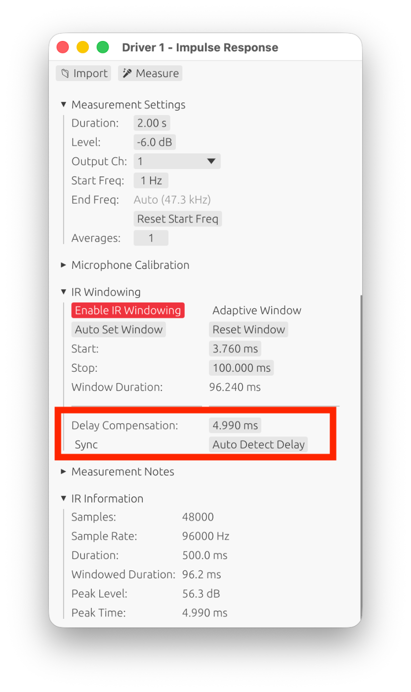 Autrement, il est très important d'activer la référence temporelle, de préférence par loopback dans le cas de l'utilisation d'une carte son pour la mesure. Les microphones USB imposent malheureusement l'utilisation de la synchronisation par chirp (méthode "Acoustic" dans LinFIR) avec une seconde enceinte qui sert de référence relative. Comme discuté précédemment, sous Windows c'est impératif. Avec Mac OS, dans la pratique on peut s'en passer si l'interface de sortie et d'entrée est la même, et réglée à 96 kHz (l'ordonnanceur de l'OS est beaucoup plus régulier, d'où la popularité des Macs dans la production audio).