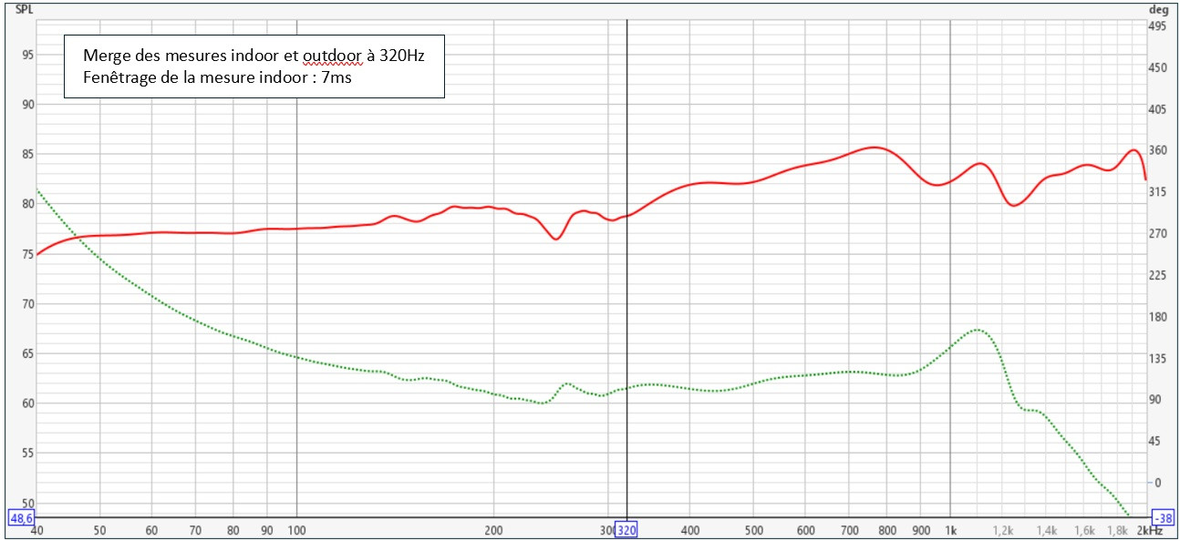J'ai ensuite effectué un merge à 320Hz, ci-dessous la réponse en fréquence et en phase résultante :