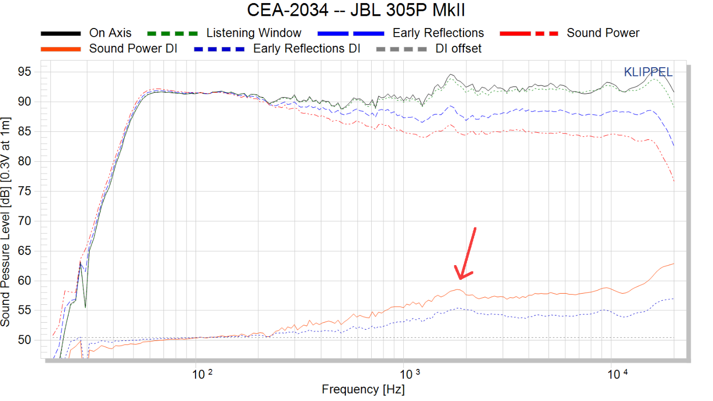 Il n'est pas possible d'obtenir, avec ces enceintes, un résultat qui soit parfait à la fois en anéchoïque et en MMM. Cette caractéristique d'une enceinte à avoir un direct différent du diffus se mesure avec la courbe dite "Directivity Index". Elle figure en bas des mesures "spinorama". Voici celle de mes JBL 305P mkii, mesurées par Erin's Audio Corner :