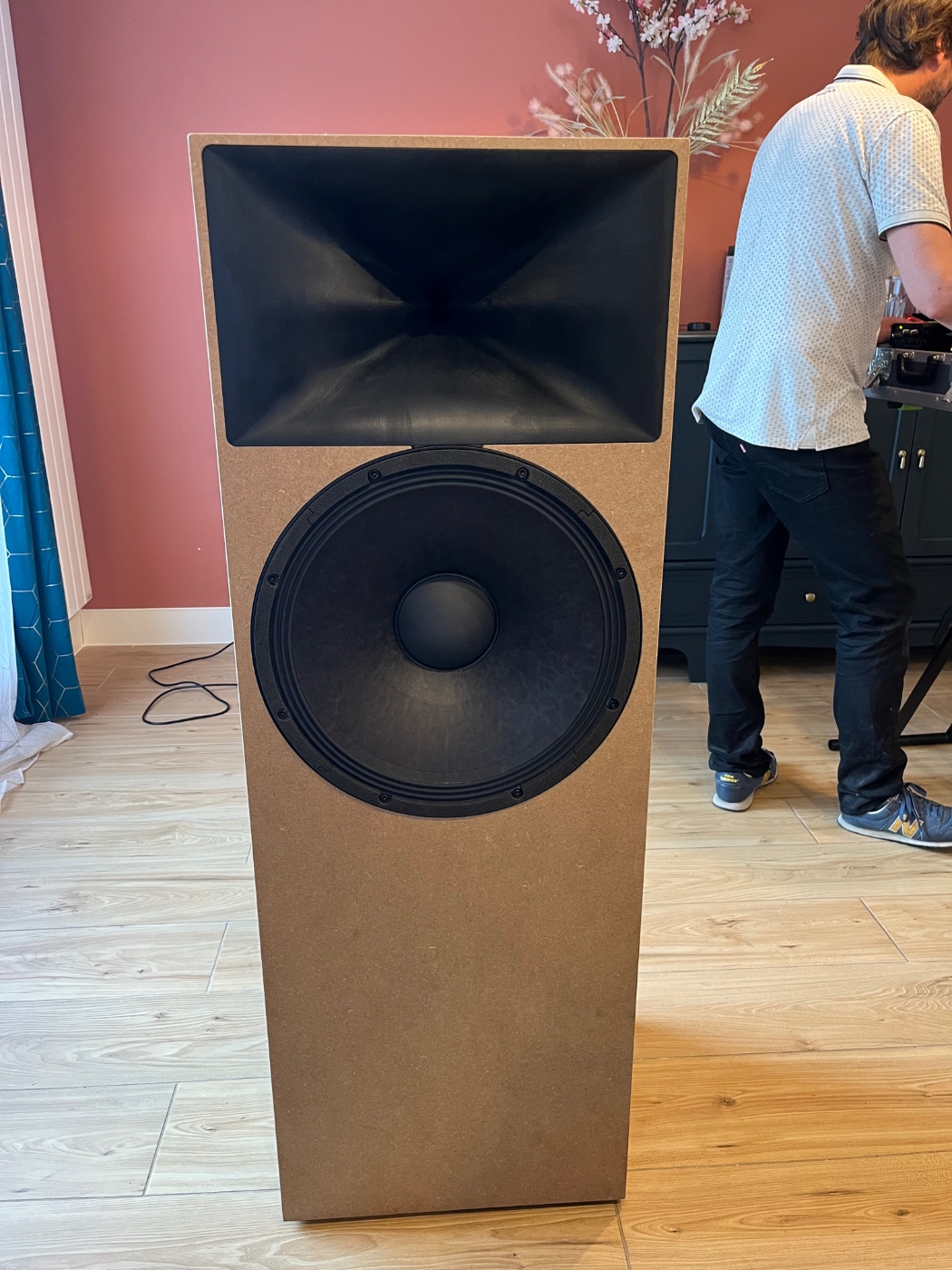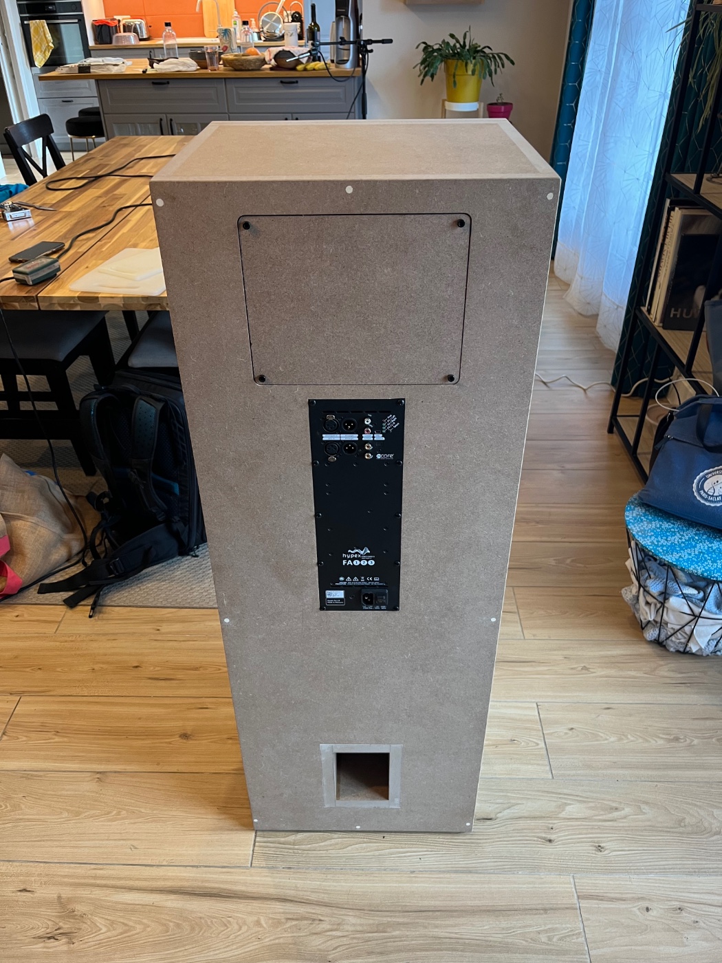 Ci-dessus 2 photos des enceintes. Vue de face avec le X40 et le 15''. Et vue de derrière avec l'évent rectangulaire et le PlateAmp FA123, ainsi que la trappe menant à la ND3T.