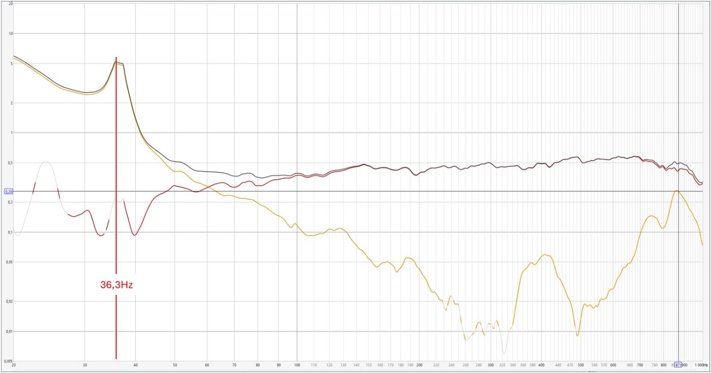 1. Le dip dans la réponse devant le cône est situé à 36,3 Hz. Il ne correspond donc pas à la fréquence d'accord !