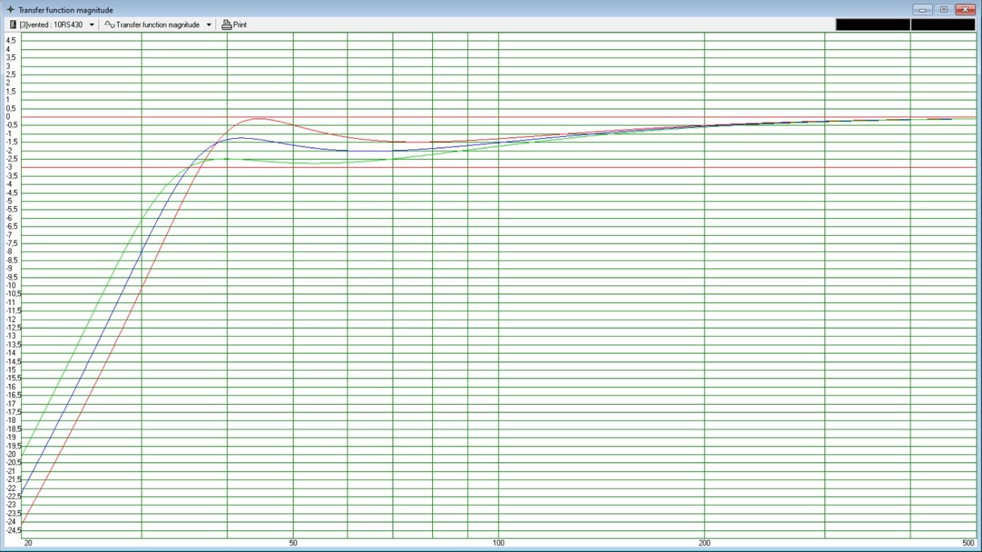 Ci-dessous les simulations WinIsd avec des fb de 39Hz (rouge), 36Hz (bleu) et 33Hz (vert) :