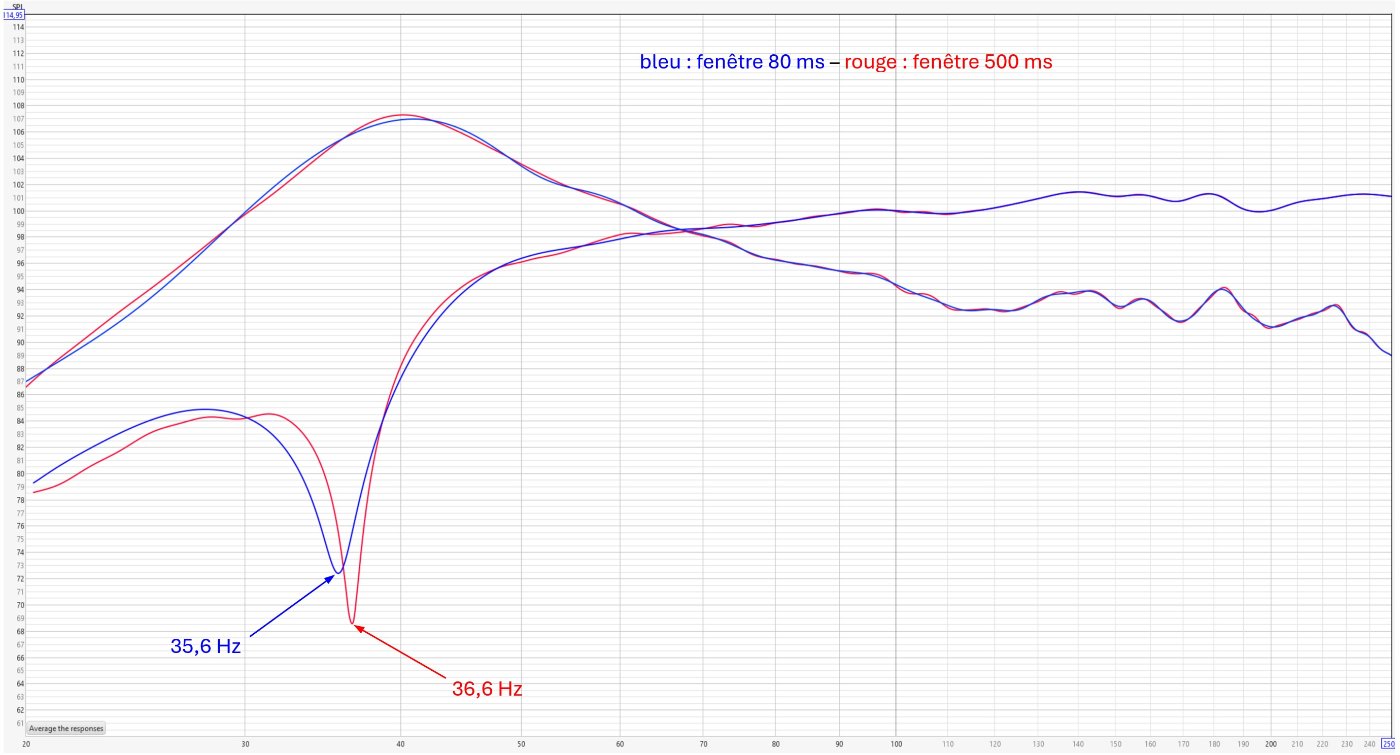 Ci-dessous la réponse de l'évent pour une fenêtre de 80ms et de 500ms, et la réponse du cône en champ proche pour ces mêmes tailles de fenêtre. La réponse de l'évent est à peu près inchangée, mais la fréquence du dip varie de 1 Hz !