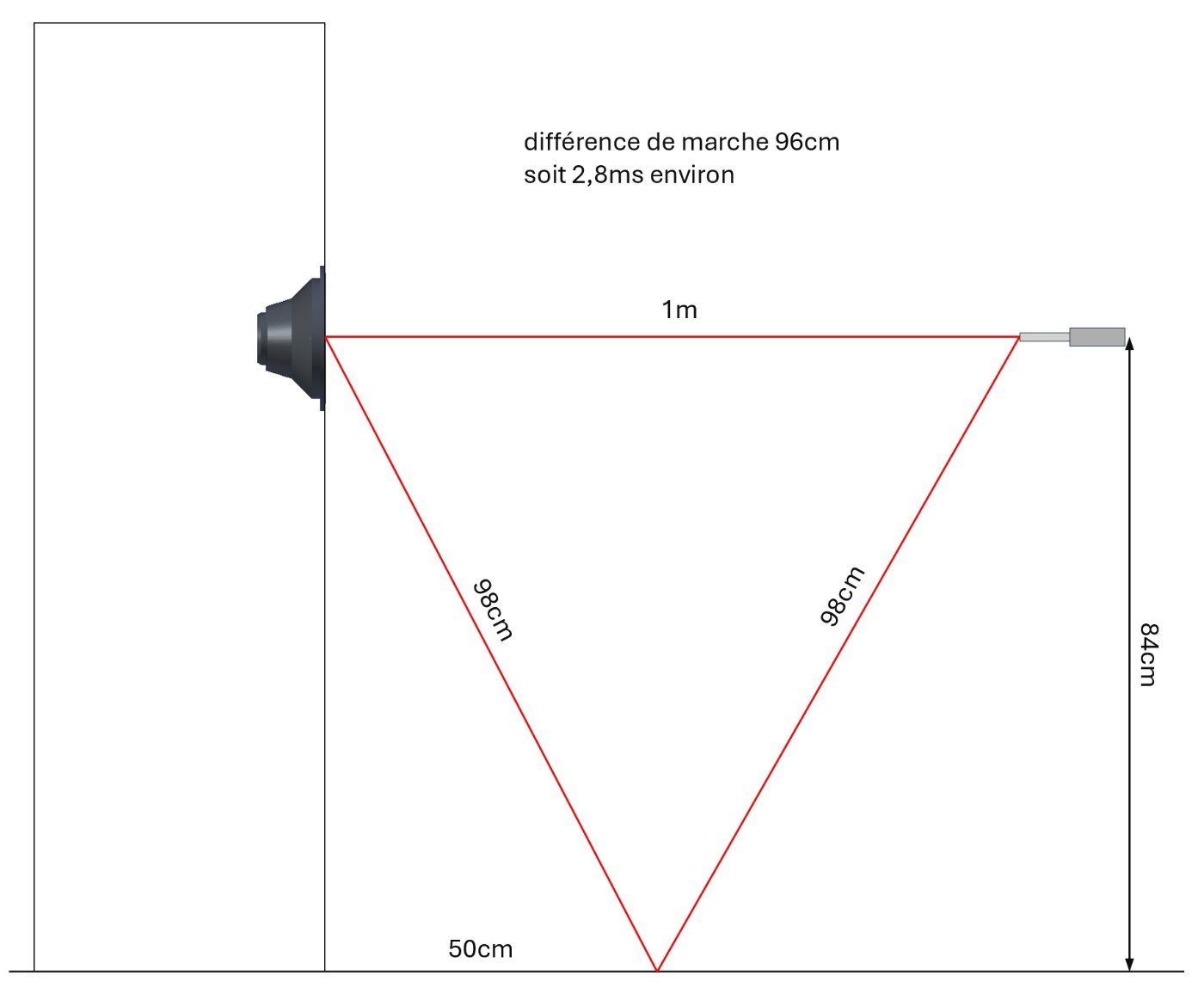 Pour bien faire, les dispositions à prendre consistent donc d'une part à augmenter la différence de marche pour que l'onde réfléchie parvienne au micro avec au minimum une dizaine de ms de retard, ce qui permet de fenêtrer la mesure de façon exploitable. Il faut donc viser une différence de marche de 3 mètres au moins, et donc placer le HP à mesurer à 2m de hauteur environ si on veut effectuer la mesure micro à 1m.