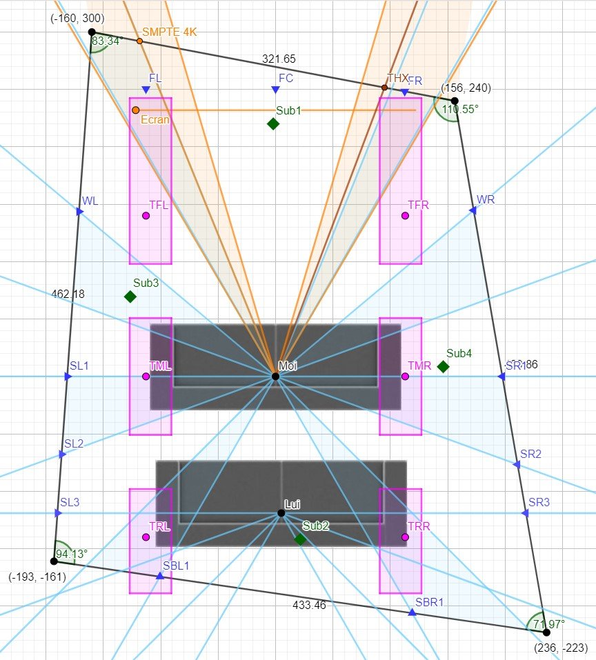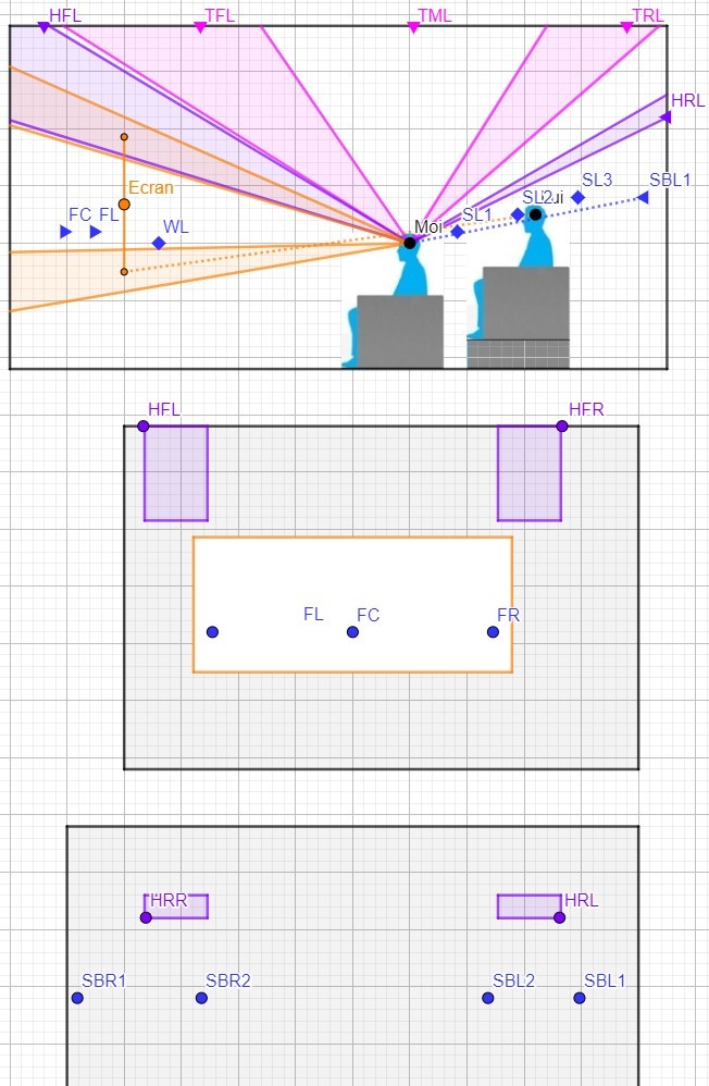 Pour ma part je suis plus proche des specifs pro que grand public notamment pour le positionnement du centre acoustique des LCR derrière l'écran et la hauteur des Surround (non Atmos).