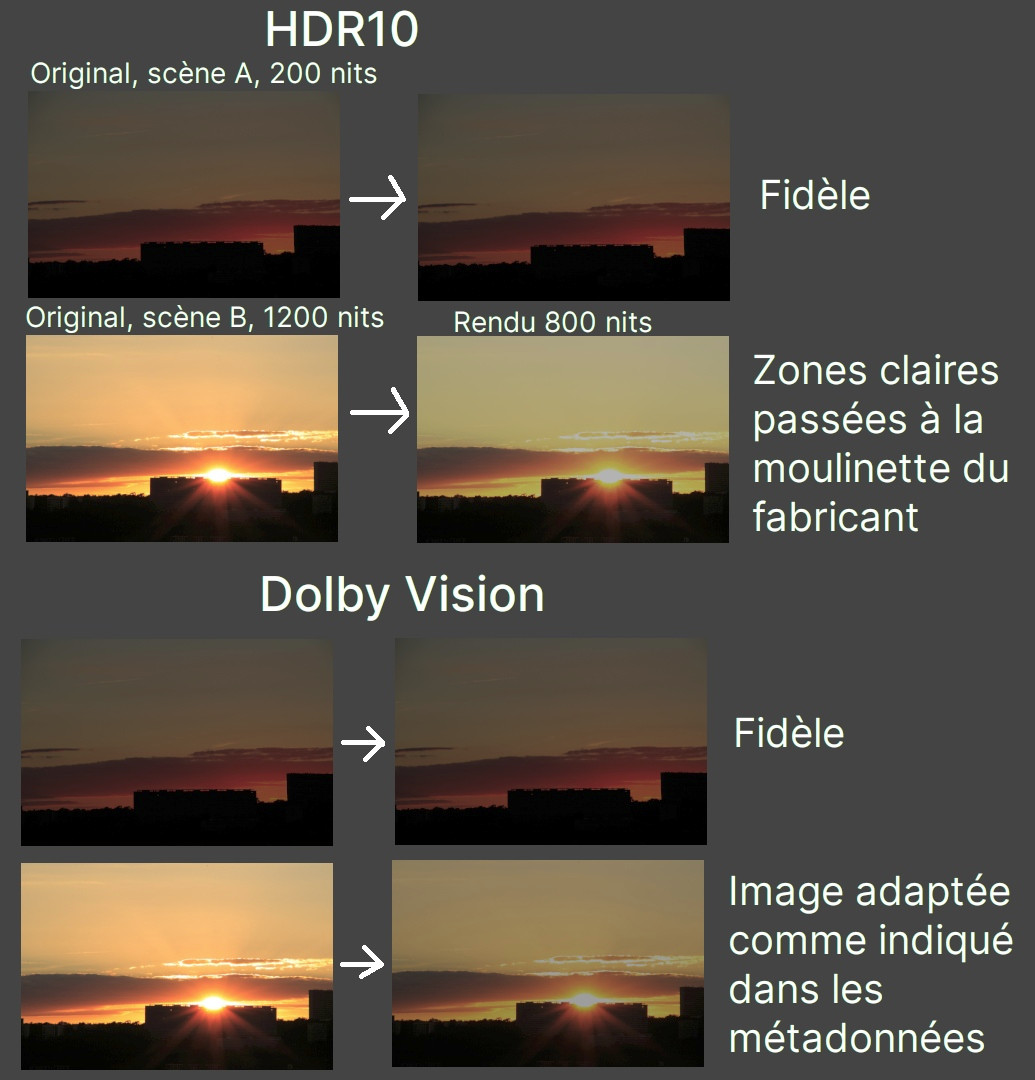 En Dolby Vision, par contre, le diffuseur va appliquer bêtement les instructions prévues pour cette scène pour les diffuseurs "1000 nits" (ou peut-être 400, je ne sais pas si on arrondit au-dessus ou en-dessous), qui lui indique de diminuer légèrement la luminosité globale, y compris sous 200 nits, et de faire rentrer les données jusqu'à 1200 dans la place gagnée. Le rendu sera alors différent du HDR10, la personne qui a créé le package Dolby Vision ayant fait un choix mieux adapté à cette scène en particulier, et ayant enregistré ce choix dans les métadonnées de la scène.