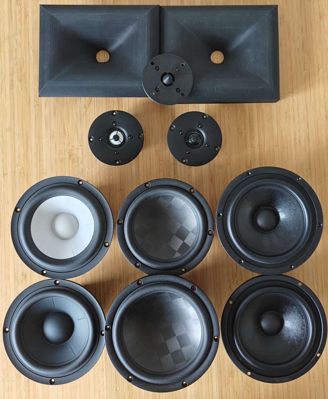 Tout le monde est là (le Sica 6.5H1.5CP et scanspeak 18W ne sont pas sur la photo)