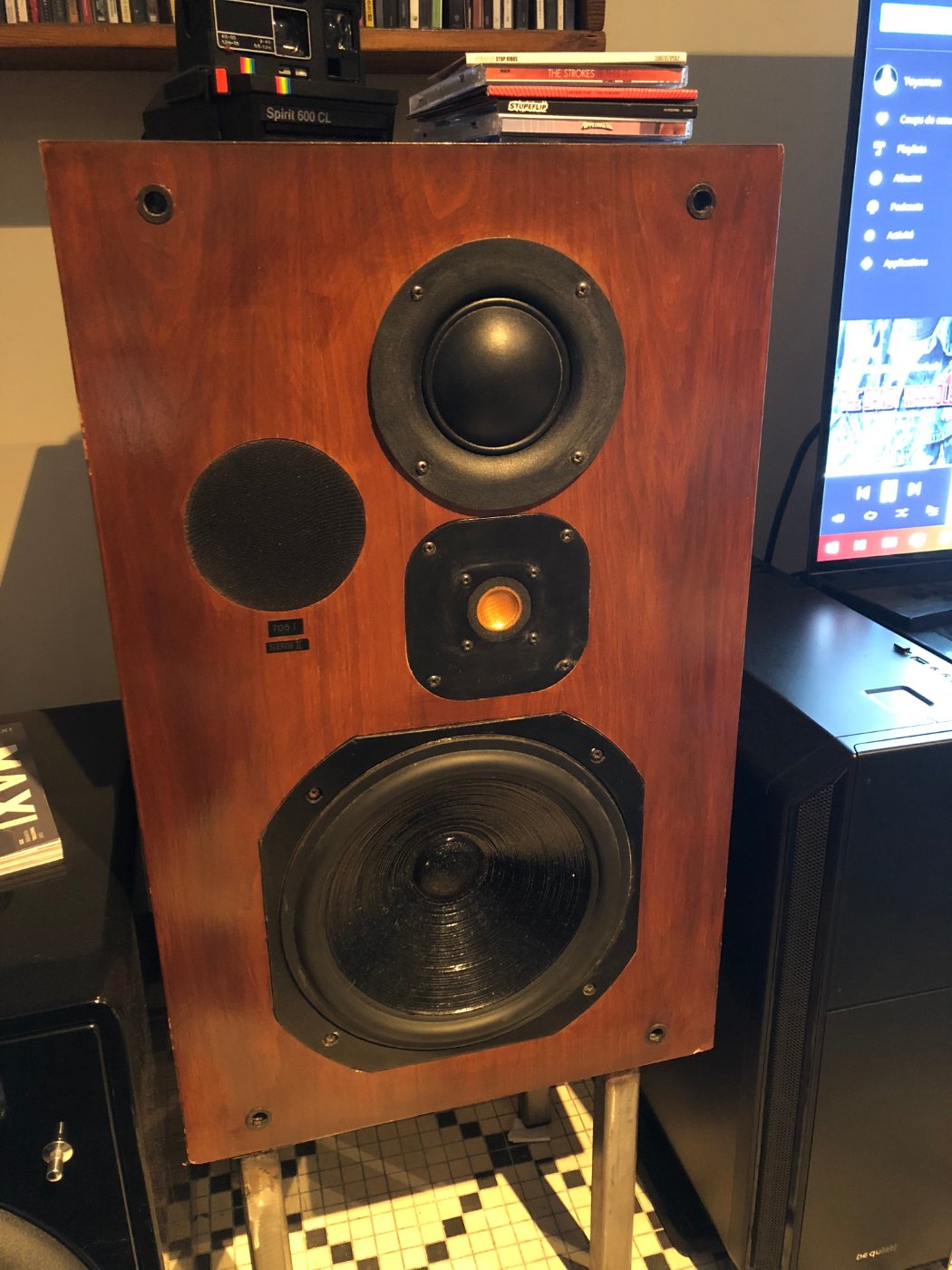 Quelque temps plus tard j'ai récupéré l’ampli Luxman L31, d'une beauté incroyable mais qui ne brille pas particulièrement par ses capacités physiques et techniques et malheureusement les petites B&W que j’avais avec grésillaient énormément + un boomer qui ne sortait plus du tout de son. J’ai donc un ampli, une TV mais pas d'enceintes à abreuver avec les watts du Luxman ni les pépettes pour en acheter (tout est passé dans la TV). Ce n'est que quelques mois plus tard que par hasard dans le grenier d'amis de la famille je tombe sur une grosse paire de vieilles colonnes (je n'y connaissais vraiment rien du tout en enceinte mais elles sont grosses alors elles doivent être bien me suis-je dit). Je leur ai donc demandé, vu la quantité de poussière qui les recouvraient s’ils voulaient s'en débarrasser en me les donnant. L'opération m'aura donc coûté une bonne bouteille de vin pour l'acquisition d'une paire d'enceinte plutôt rare, à savoir des “JM Lab 705i série II". J'apprendrais par la suite, quand elles ont commencé à déconner qu'il fallait remplacer les 2 tweeter à dôme inversé en kevlar, et remembraner les 2 woofer de 21 cm (j'entends 1 par enceinte bien sûr).