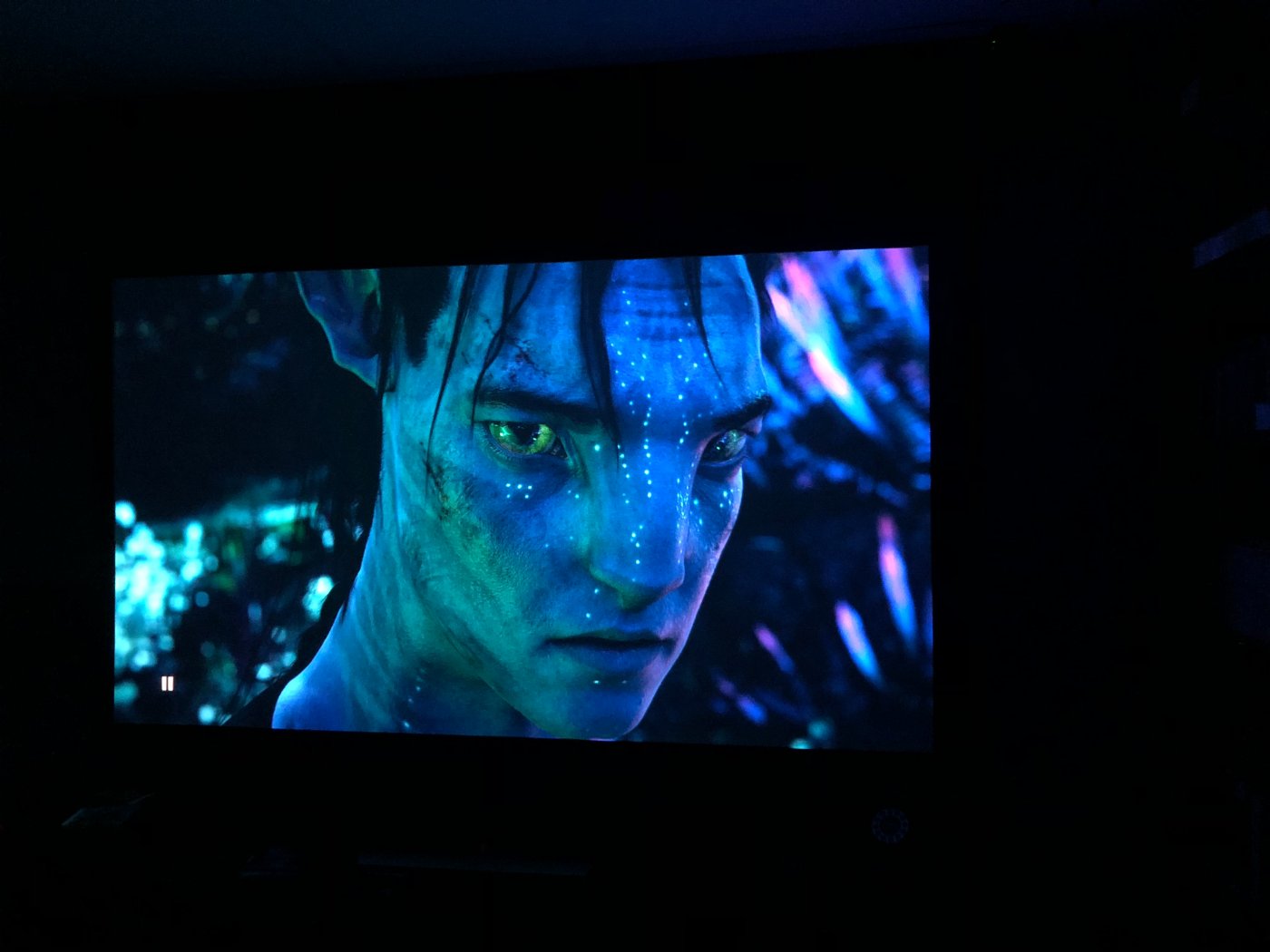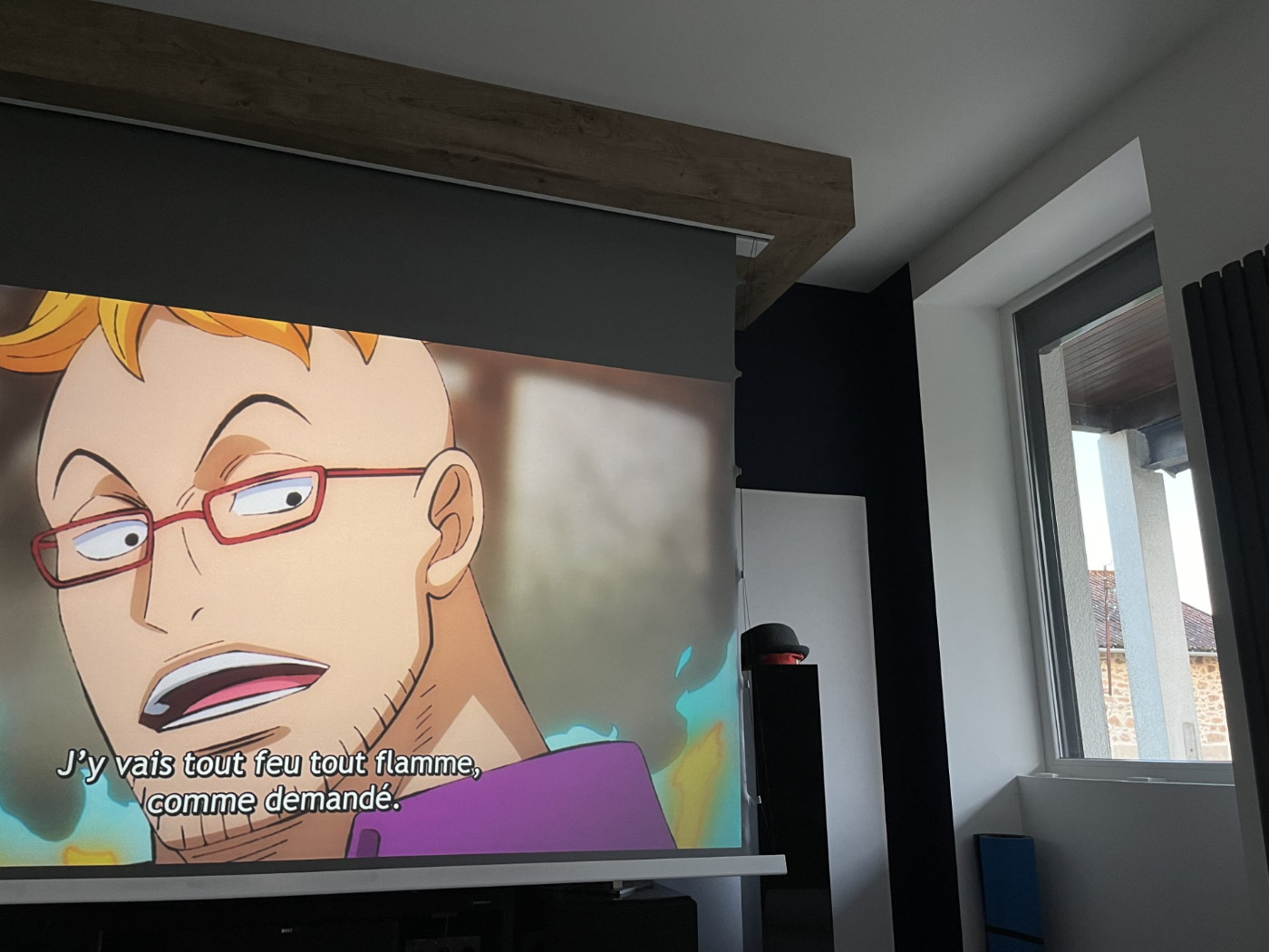 Concernant la lutte contre la lumière ambiante, ça fait très bien le boulot, surtout pour l’éclairage venant du plafond, en revanche pour la lumière venant du côté (fenêtre et baie vitrée) je trouve que c’est un peu moins efficace pour une luminosité « équivalente » à celle de l’éclairage de la pièce. Dans tous les cas par rapport à mon ancienne toile blanche ça permet largement de profiter d’une petite série/vidéo YouTube à partir de la fin d’après-midi / début de soirée en restant en mode lampe bas dans des conditions « convenables » sans avoir besoin de plonger la pièce dans le noir complet. Et c’est quand même bien appréciable.