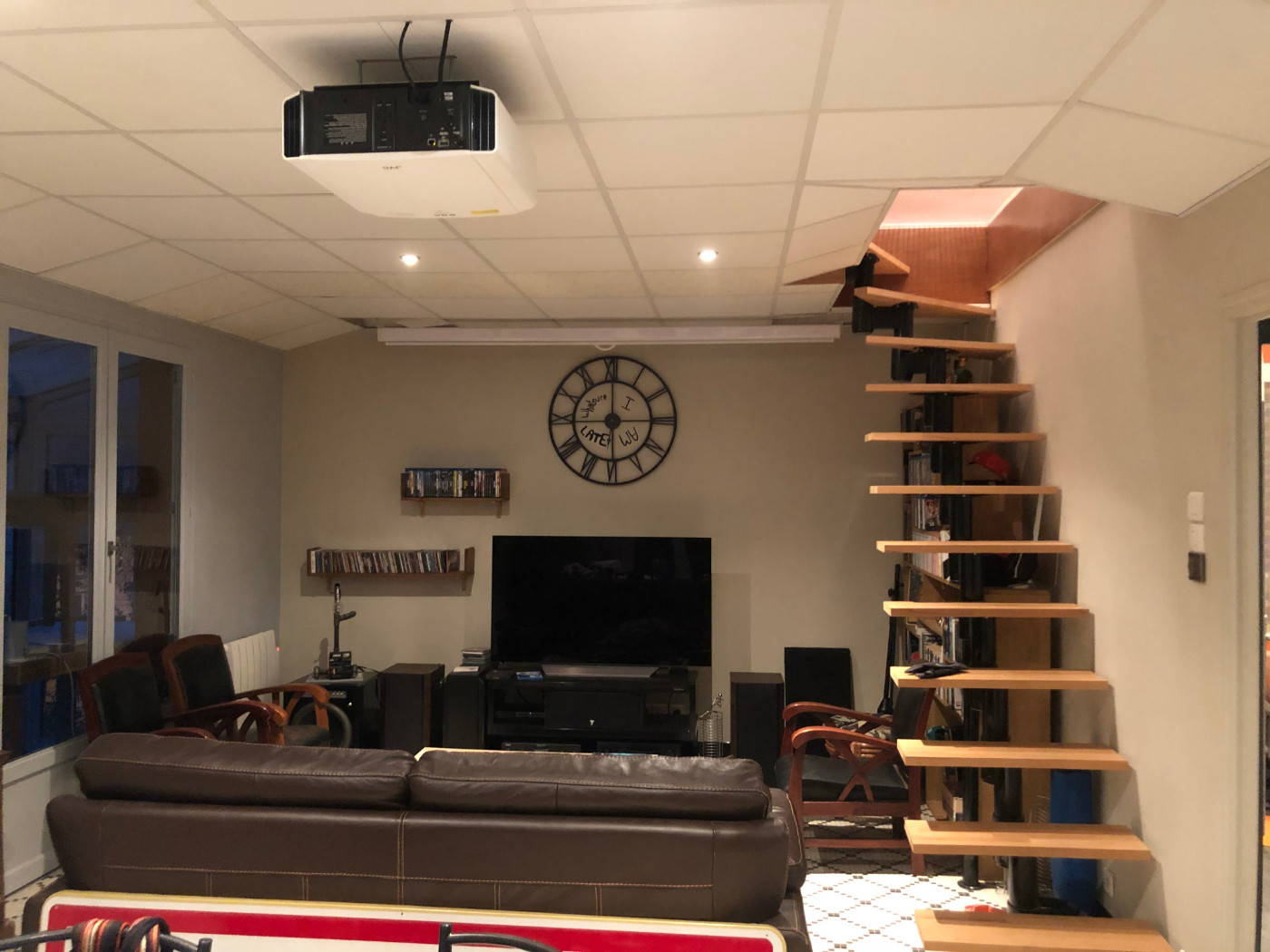 Je suis enfin complètement satisfait de mon installation et de son rendu. Pour preuve je n’ai pas changé de matériel depuis près d’un an, ni même touché aux réglages que ce soit pour l’image ou le son. On profite juste en écoutant et en regardant. J’ai aussi ajouté dans le coin droit du salon sous l’escalier une bibliothèque que je me suis fabriqué moi-même et dont je n’étais pas peu fier !