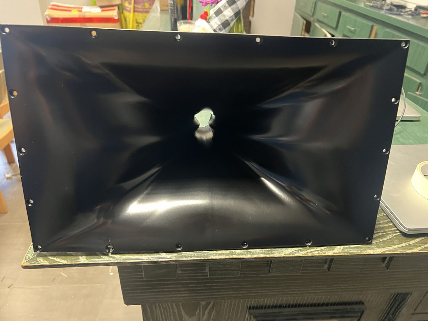 L'enceinte est donc de faible hauteur et utilise le même 15" que les enceintes D et G, mais j'ai fait le choix d'un pavillon différent, particulièrement linéaire (directivitée constante) hors axe, un AudioHorn X-Shape X40, choix possible car le préampli AV permet des égalisations graphiques permettant de compenser dans l'axe, l'énergie répartie hors axe.