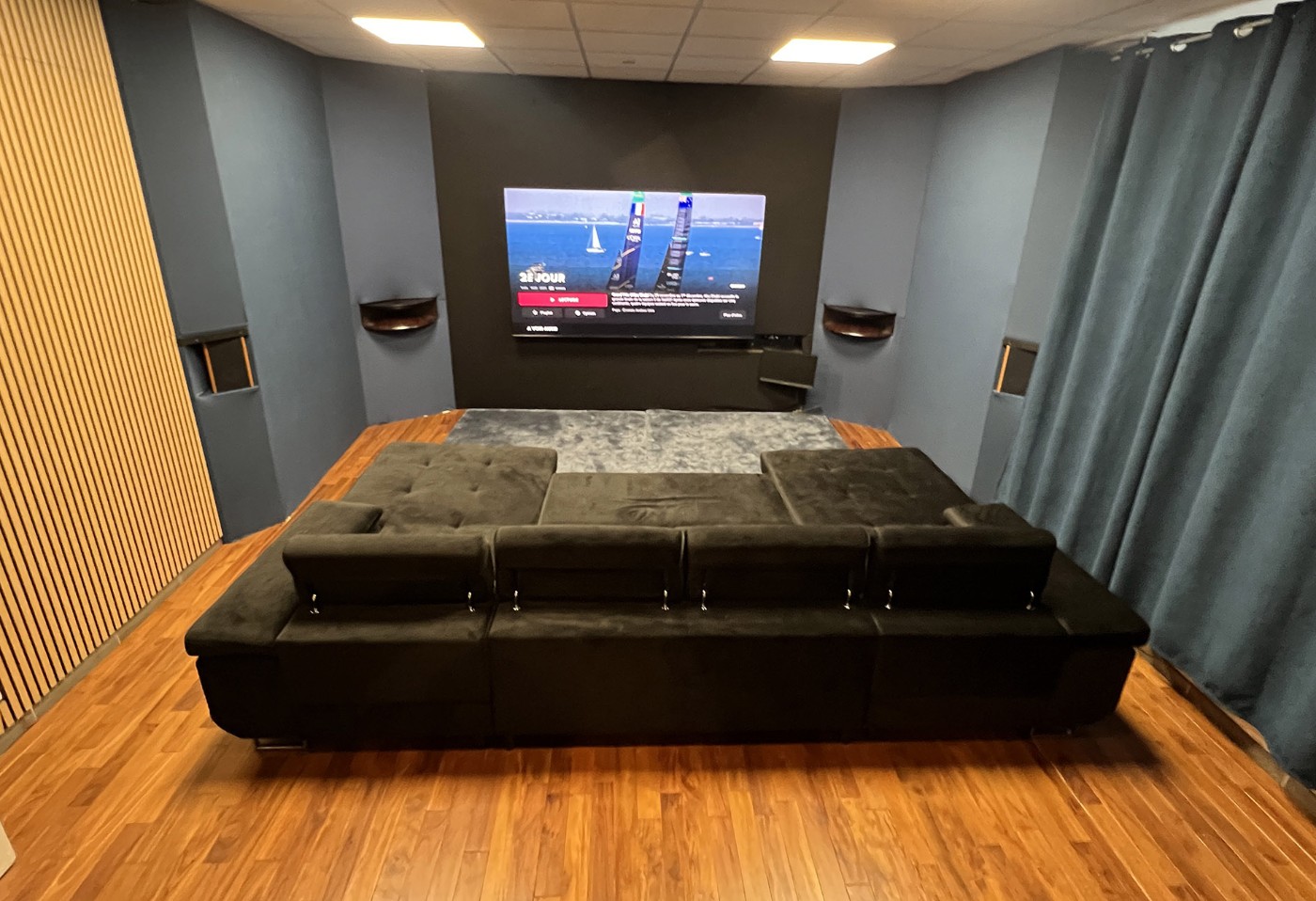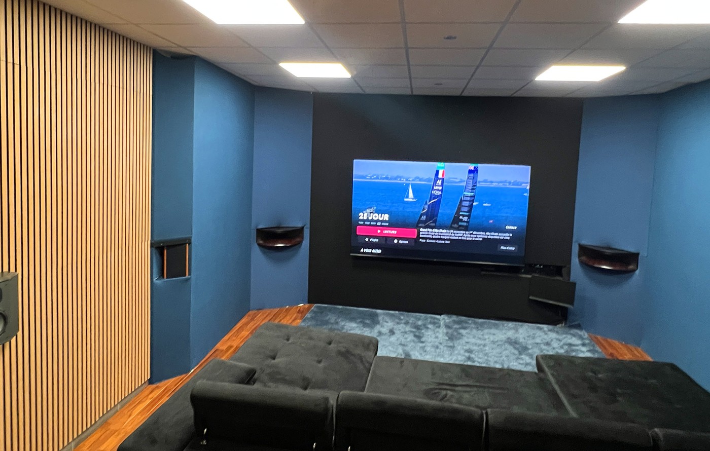 Ce n'est pas une salle dédiée et exclusivement réservée à l'écoute de la musique ou aux visionnage de films, d'ou le choix d'une grande TV et d'un mur acoustique qui intègre les enceintes et rends l'ensemble de l'installation invisible, le but étant de rester WAF compatible.