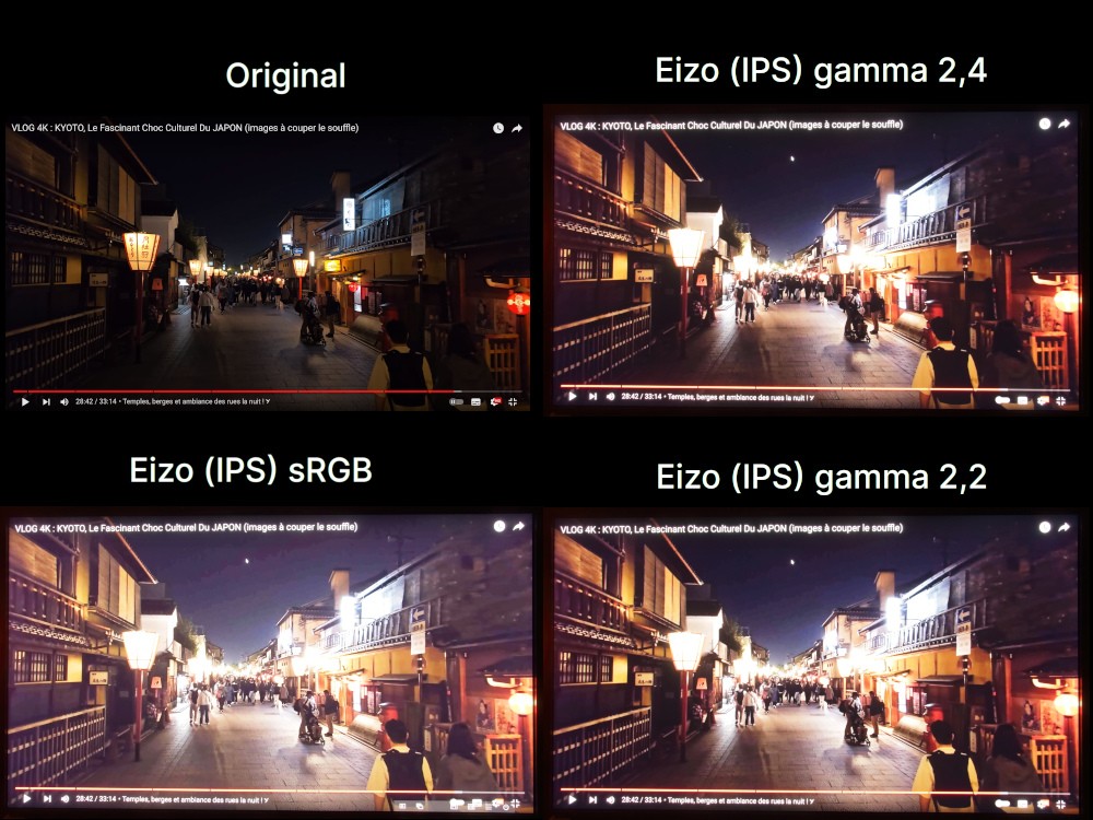 L'Eizo conserve le même gamut, le même point blanc, la même luminosité, mais utilise successivement trois EOTF différentes : sRGB, gamma 2,2 et gamma 2,4.