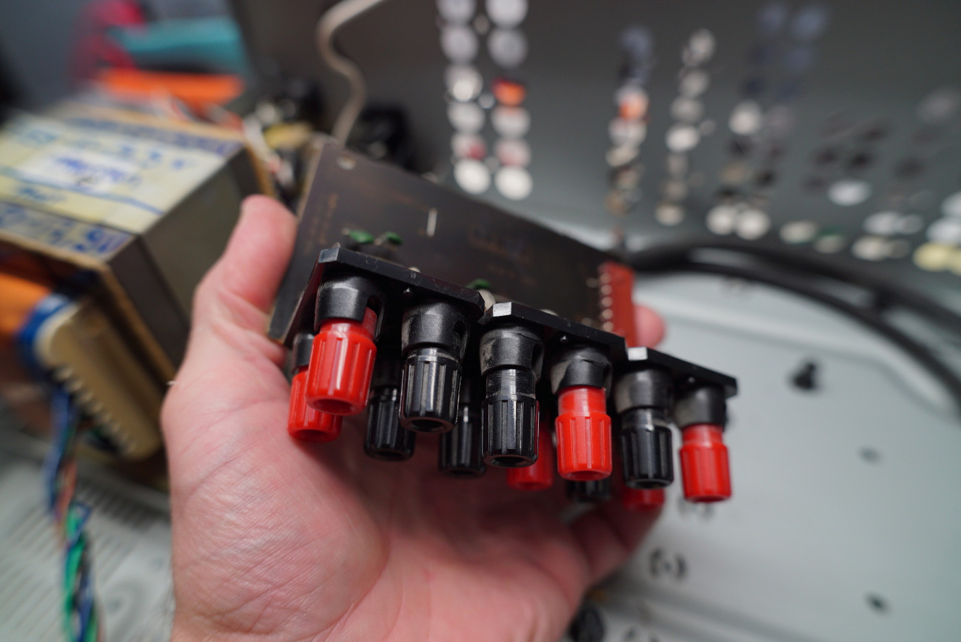 Fainéant que je suis, ces boitiers me rendent la tache facile, les prises RCA et connexion de câble enceintes sont déjà là ! Idem pour le 240v. Les circuits imprimés en bakélite cassent facilement et se dessoudent bien.