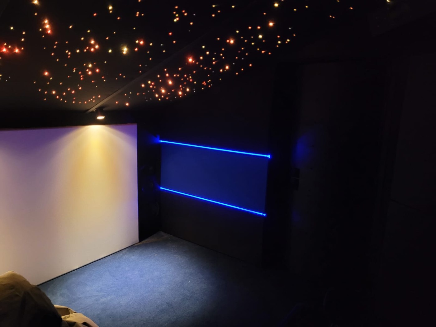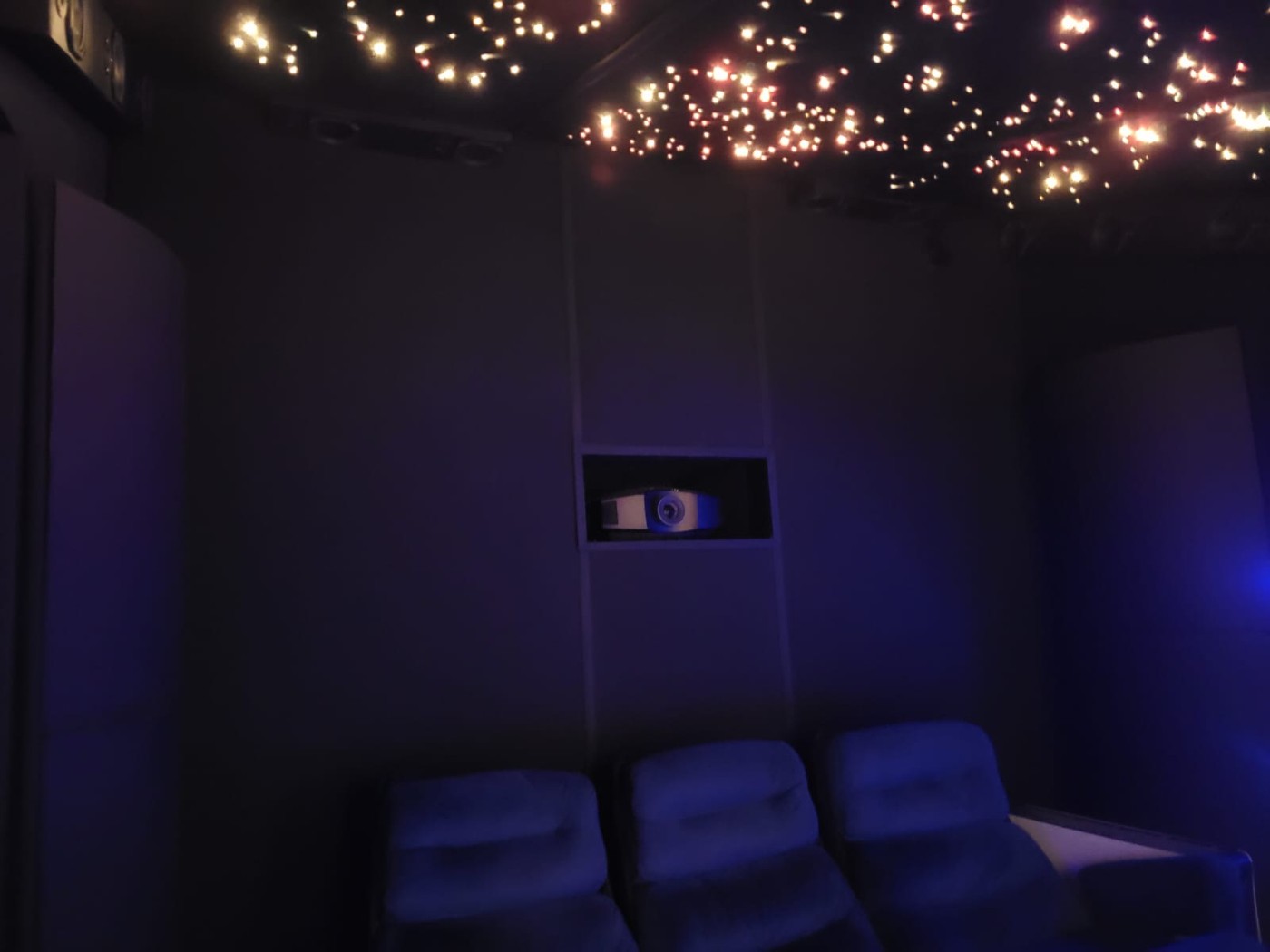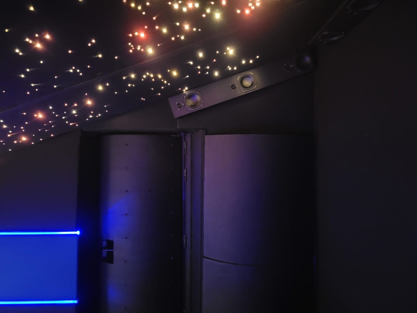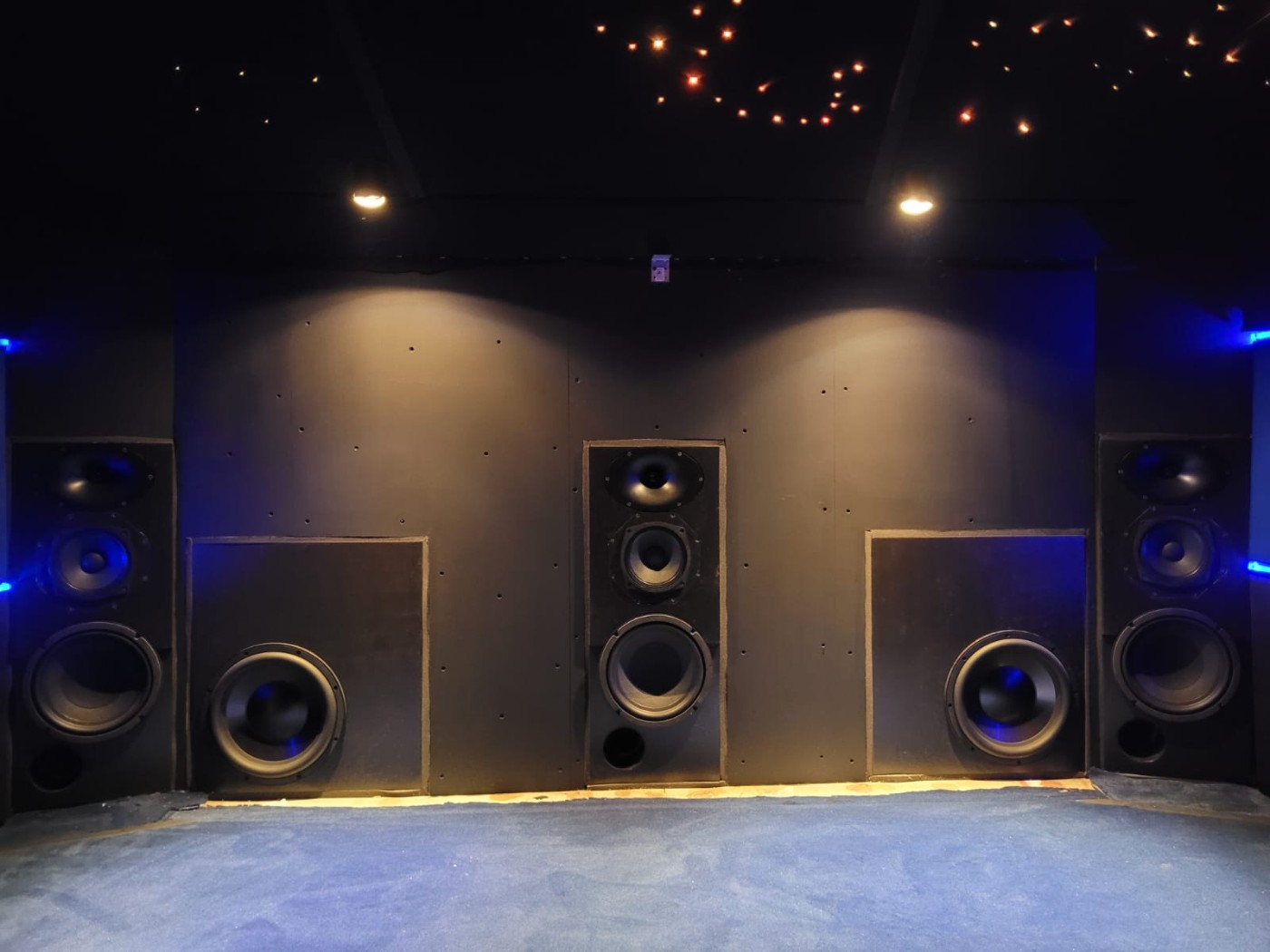 Pour les surround j'ai réalisé un array de 5 enceintes par côté , disposé vers le plafond, placé légèrement vers l'avant du point d'écoute jusqu'à l'arrière des fauteuils, très belle bulle surround