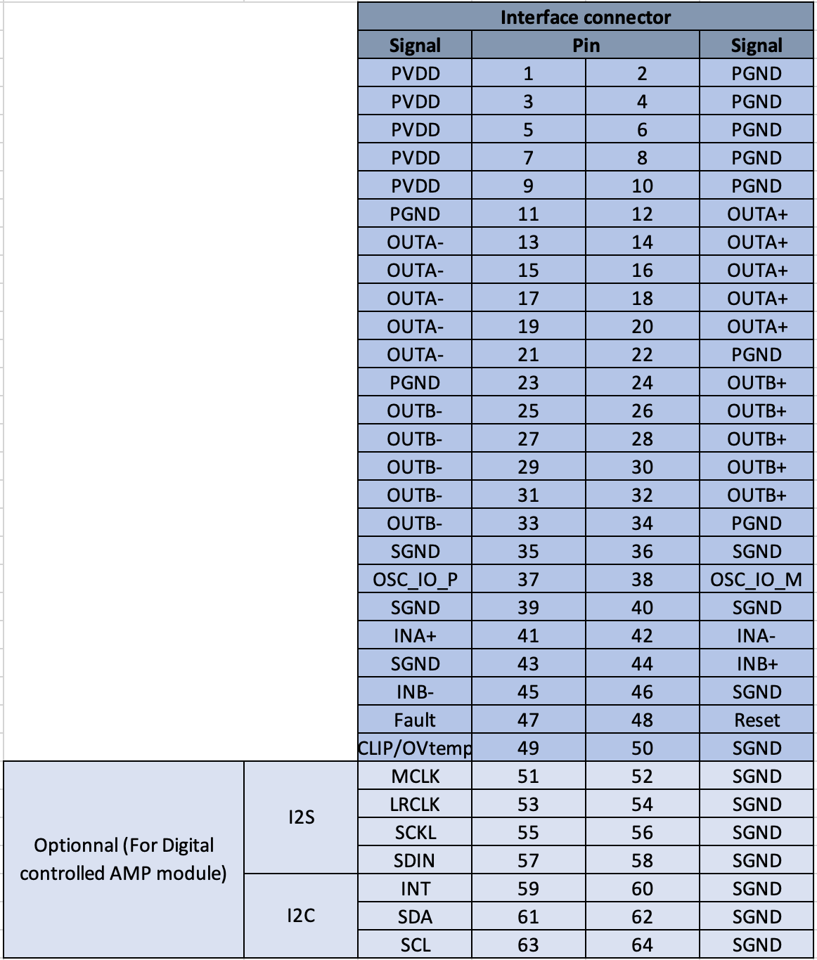 tout rentre sur un connecteur 50 points au format 2.54mm, on passe 3A par contact en continu. Pour l'alimentation du 52VDC sera l'idéal.