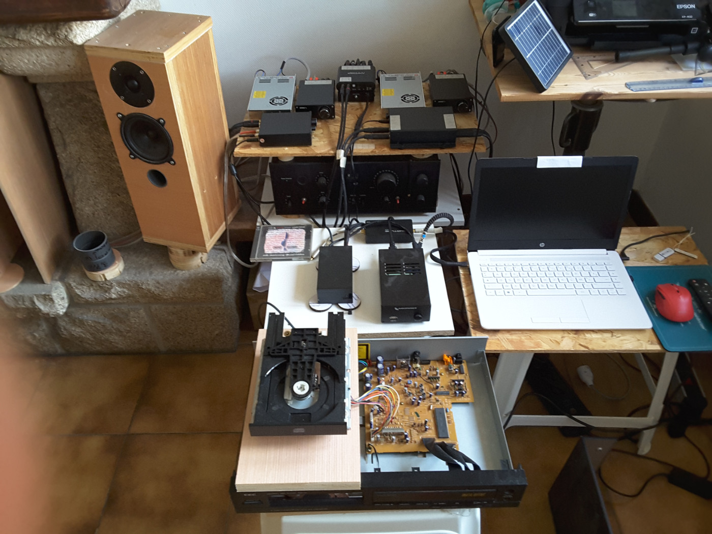 il est aussi possible entre autre de connecter (en optique sur la photo)directement un lecteur cd sur un DAC et gérer le volume avec la télécommande du DAC, pas besoin de pré-ampli et bonne qualité de son avec un cd de test de Chesky Records, le seul qui me reste pour faire des essais. La boite de grave en H frame avec deux 12’’ est dans la cheminée.