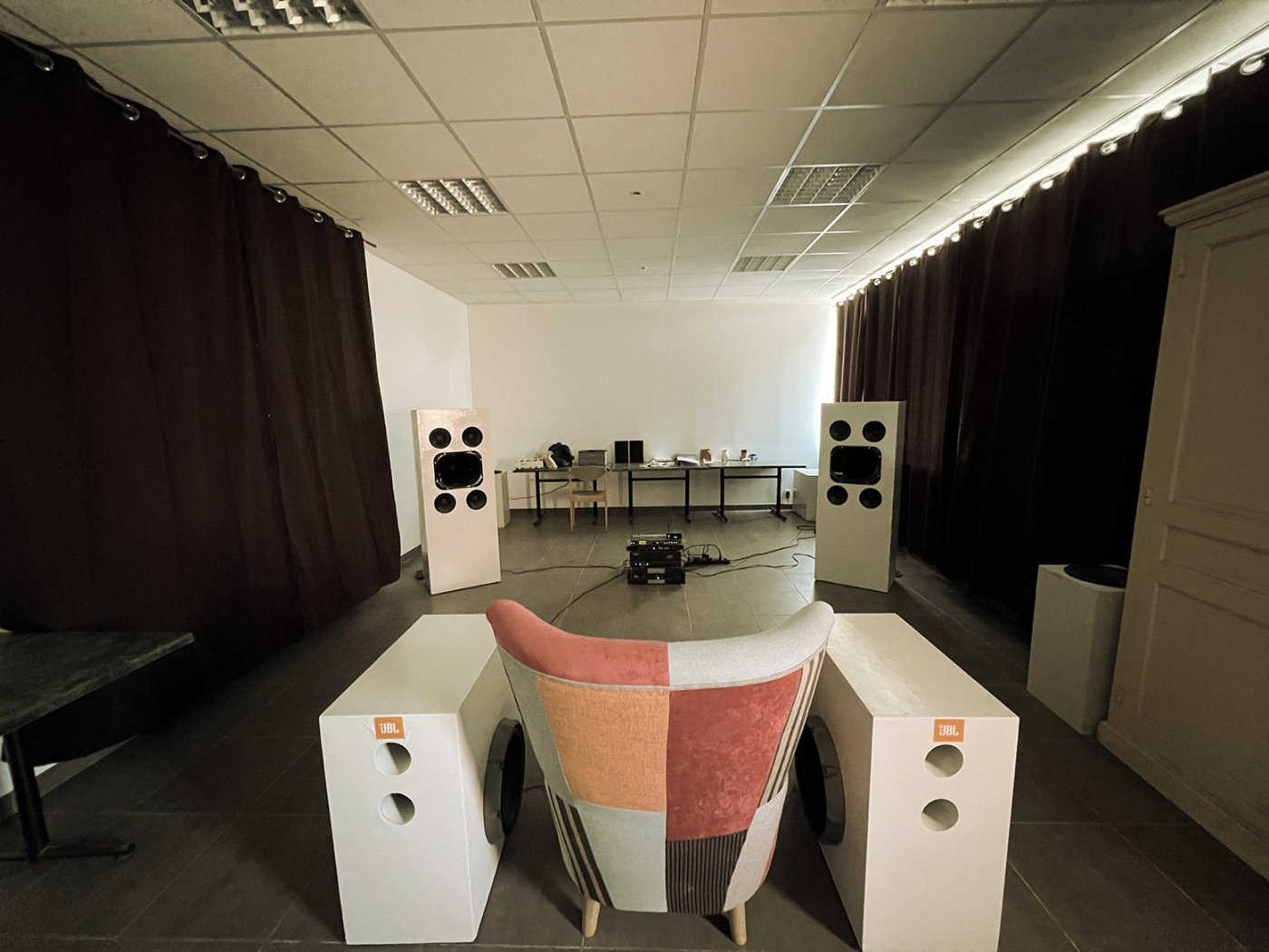 comme dans toutes les petites salles de petits volumes , il subsiste malheuresement encore des effets indesirables de modes qui sont tres visibles sur des mesures multipoints et audibles en se déplaçant dans la salle.