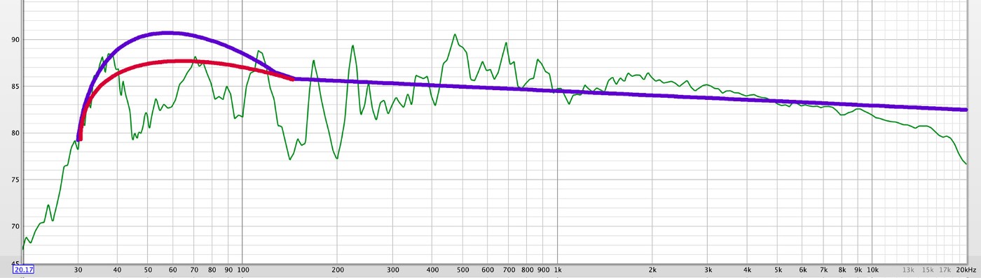 Pour le grave il faut tester par itérations en MMM et viser entre les 2 cibles suivantes, en rouge, peu de grave, en mauve, léger bass boost.