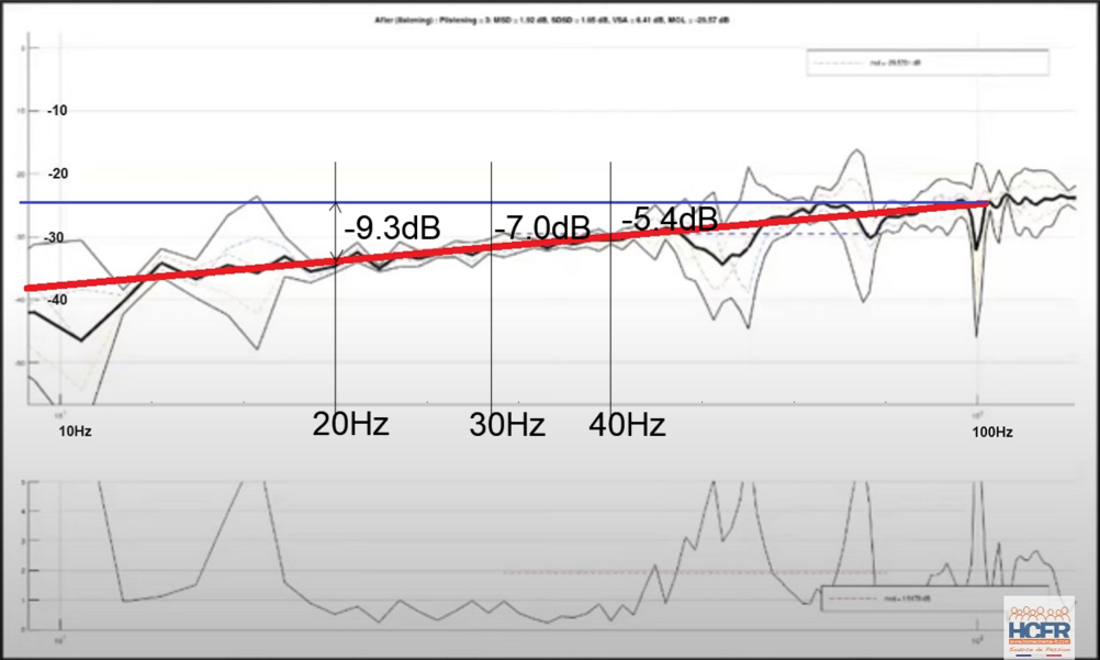 Voir le spectro avec et sans SBA Je serais curieux de voir le niveau des basses entre 20 et 50Hz dans la salle de Roland. On n’est certainement pas -6dB en en dessous du 40Hz. Il faut savoir que pour entendre ces fréquences, il faut clairement beaucoup plus niveau.
