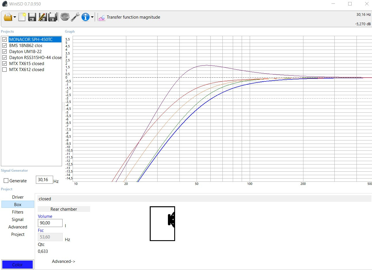 Ben comme on disait : 100L environ en clos et une EQ pour remonter le niveau vers 35Hz. Avec les Dayton UM18 l'EQ serait bien moins forte..