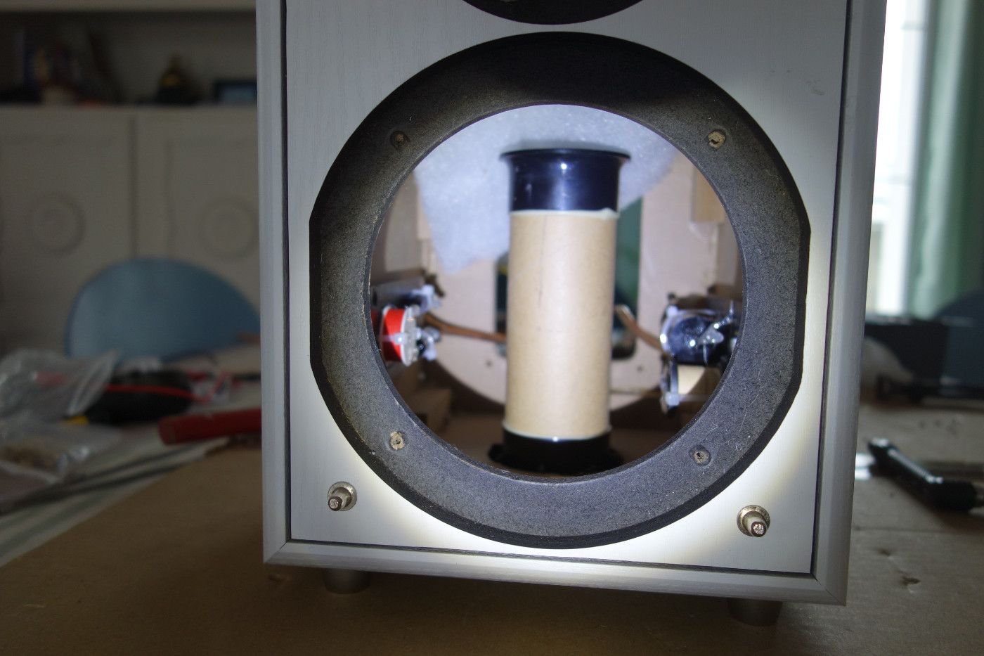 Difficulté n°4 : le manque d'espace pour fixer les 2 RLC dans l'enceinte. Conseil : vraiment tout démonter notamment les 2 haut parleurs pour libérer un maximum d'espace et faciliter l'accès. Comme je n'avais pas de Dremel, j'ai fait des avant trous pour mes vis avec un clou et en tournant un forêt manuellement mais c'est vraiment pas évident. J'ai maudit l'évent visiblement non démontable. Du coup, je n'ai eu le courage que pour 2 vis par plaque (4 prévues initialement). Il faut un tournevis très court ou à angle droit...