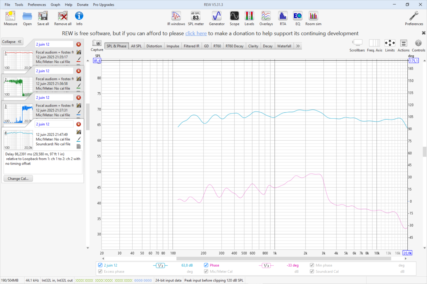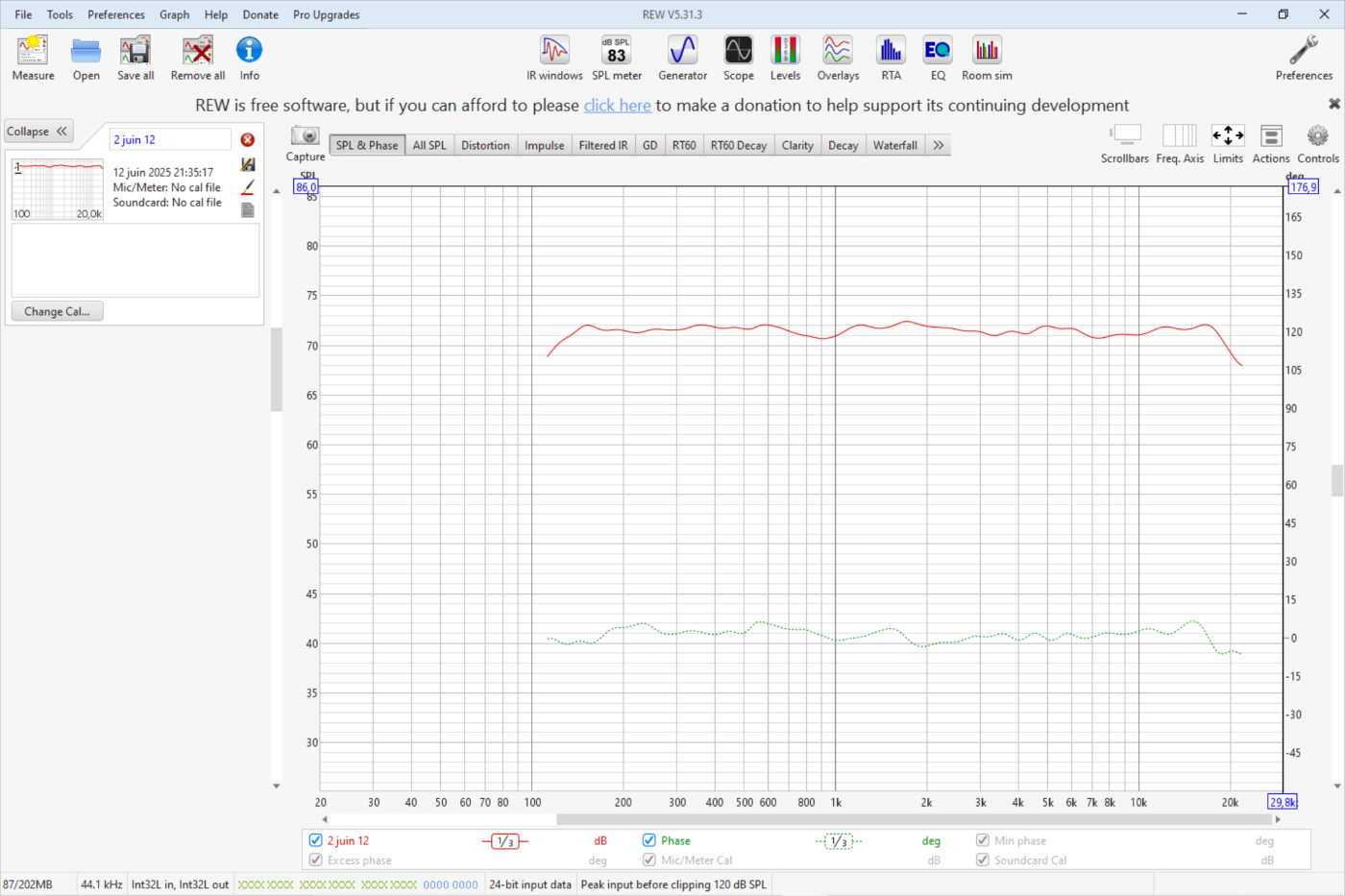 Bonsoir Wakeup et merci. Merci aussi Dagda. J'essaye de comprendre. Donc, déjà, je vous tire mon chapeau. En effet, j'ai un décalage en phase si je déplace mon micro. Mais, à la mise au point à 30cm, tout est droit ou presque. Vous voulez dire que la phase doit rester droite quand on déplace le micro? Si je posais la question du fenêtrage, c'est que je pensais que notre cerveau + oreille pouvait le faire au-dessus de 300hz environ et dans la mesure où la pièce d'écoute n'est pas trop réverbérante.