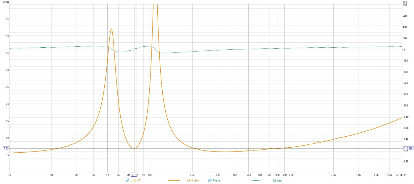 J'ai refait toutes les mesures d'impédance a l'instant, en calibrant bien tout comme sur la vidéo. W et T a l'air, dans l'enceinte, sans et avec damping. Je posterais plus tard.