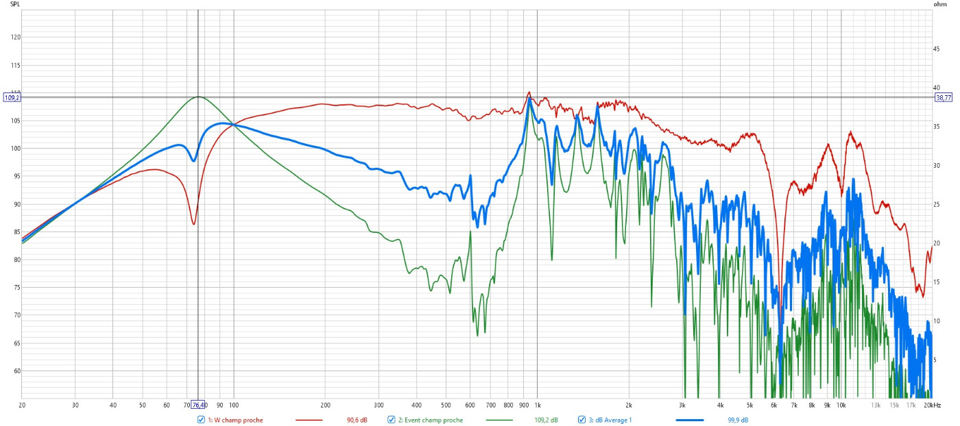 Impédance : sans aucun amortissant, c'est propre, avec un accord à 77HZ pour 76HZ simulé. Et la mesure champ proche du HP et de l'évent (corrélé) + sommation.