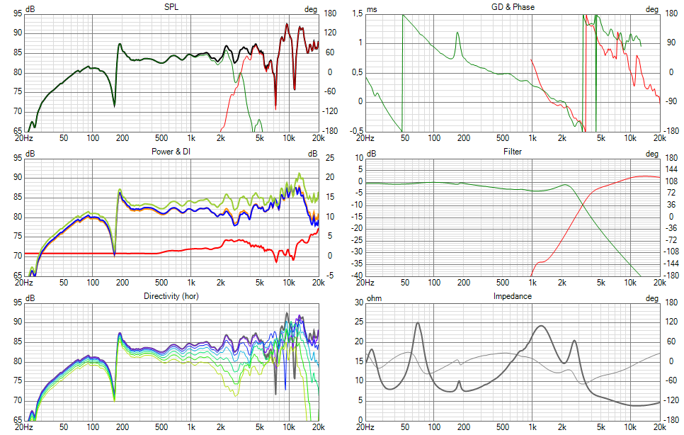 Est ce dû au filtre qui créé une bosse vers la fréquence de raccord dû à cause de l'effet de baffle non corrigé ou au fait que le tweeter, même s'il a sont pavillon avec la membrane du 22, subit son logement qui lui confère des accidents assez marqué dans la courbe entre 7 et 11k suivant les angles, je ne saurais pas le dire je n'ai pas vos compétences.