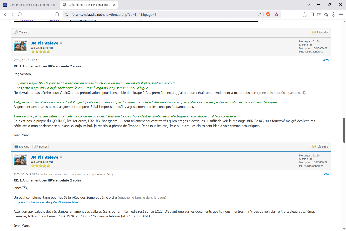 Pio2001 a écrit : 17 juin 2025, 13:24... Mais en toute généralité, je compléterais tes propos en indiquant que la phase à l'intérieur de l'intervalle de recouvrement entre les deux HP (par exemple de 1000 à 4000 Hz si on filtre à 2000 Hz) est importante pour s'assurer que les sons émis par l'un et l'autre s'additionnent bien.