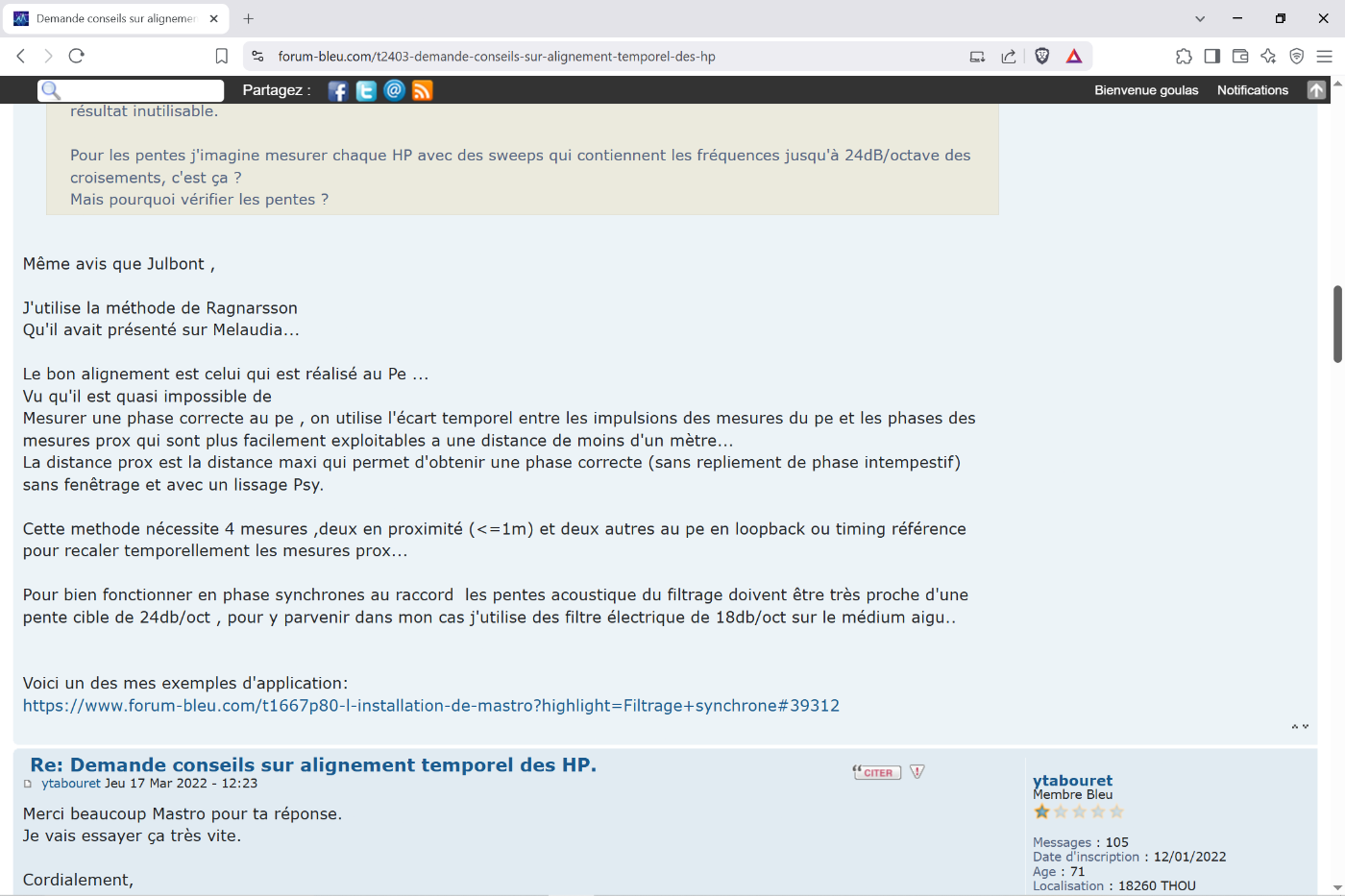 Sur une petite enceinte dont on peut facilement se satisfaire de mesure à 1m pour la mise au point. Je corrige tout de même les délais des impulsions avec une mesure au point d'écoute (certainement ce qui est aussi expliqué dans les liens de Goulas juste avant).