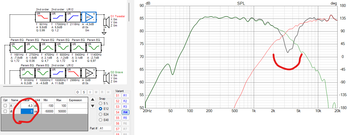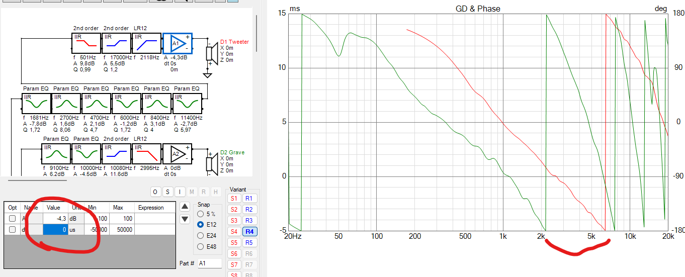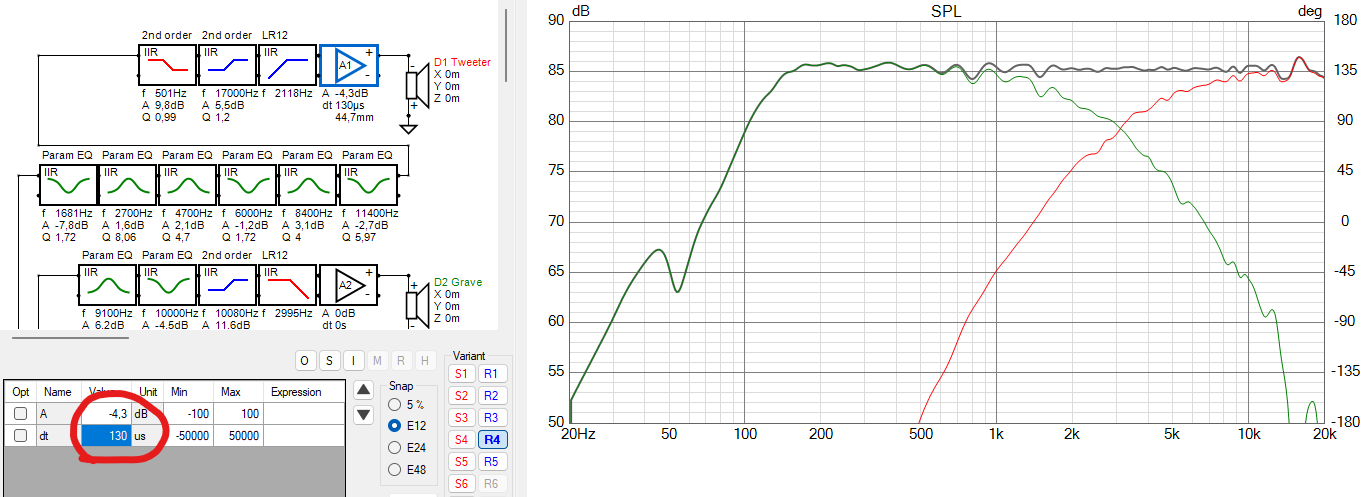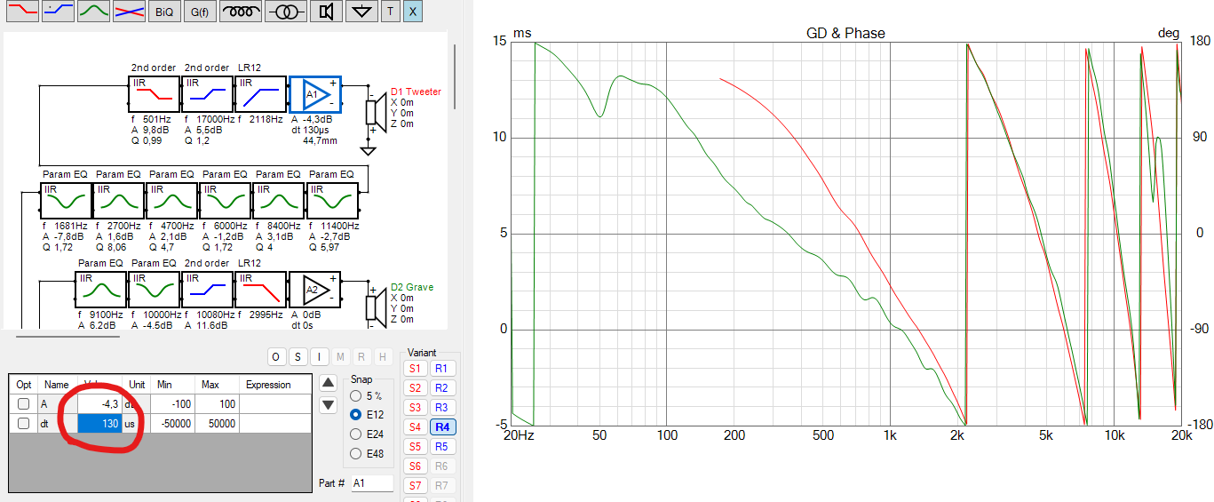 Ici tu as un filtrage actif avec un délai d'appliqué sur l'aigu à 0.13ms