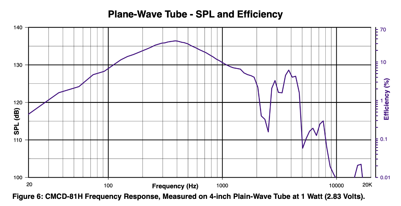 Compte tenu de la force du moteur plus élevée et de la masse mobile égale (cône plus petit), nous voyons que le 8" 2250, malgré sa surface plus petite de membrane, offre une plus grande sensibilité dès lors que le pavillon fournit une charge d'impédance acoustique suffisante".