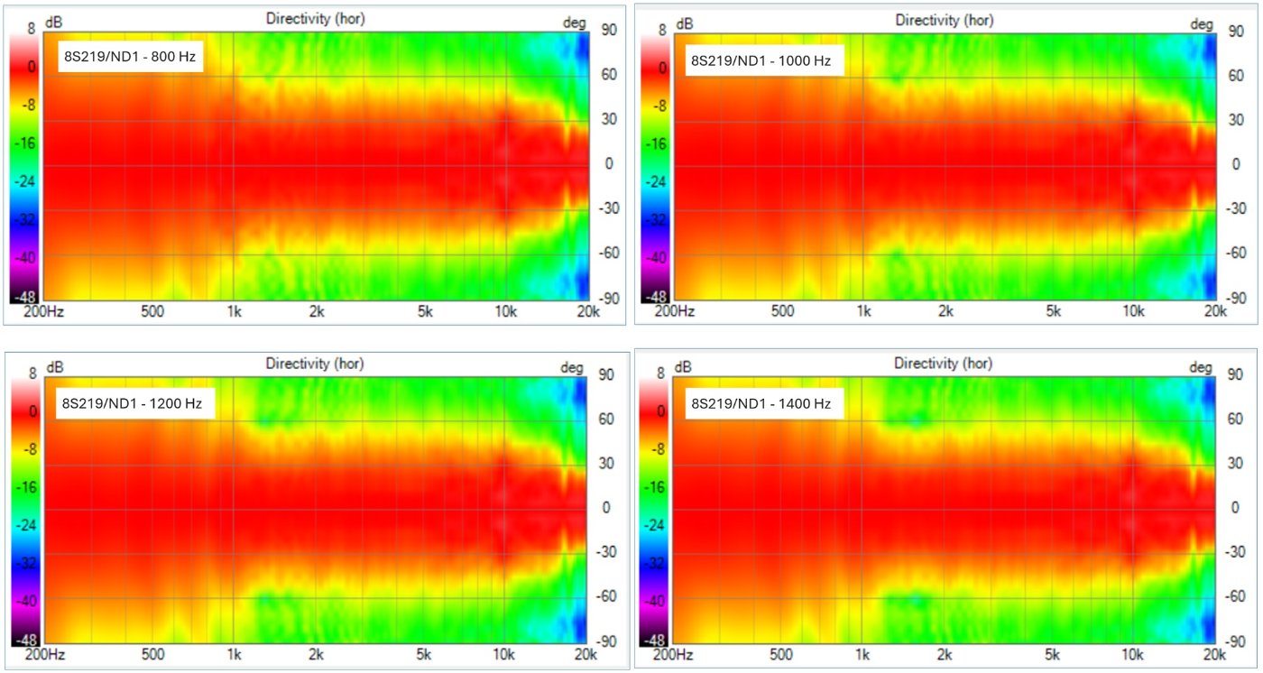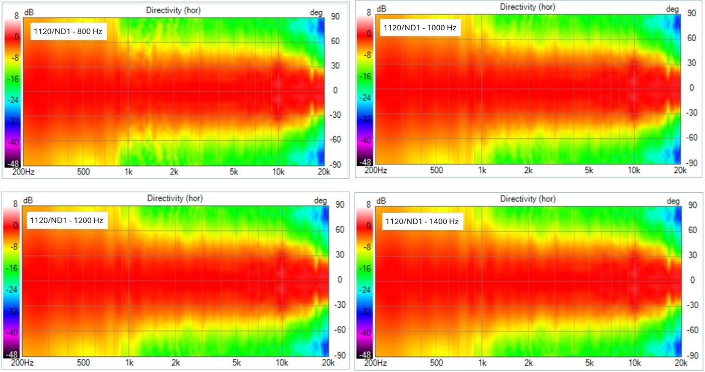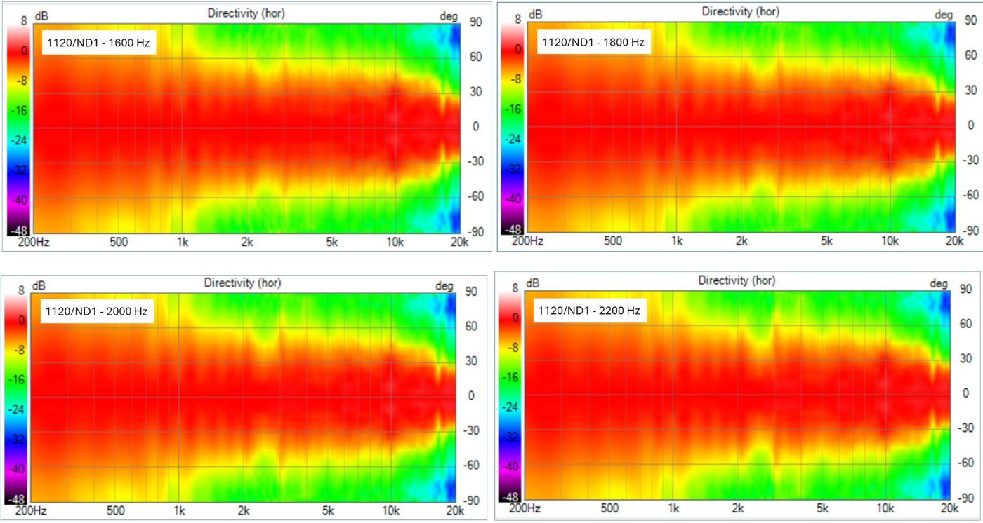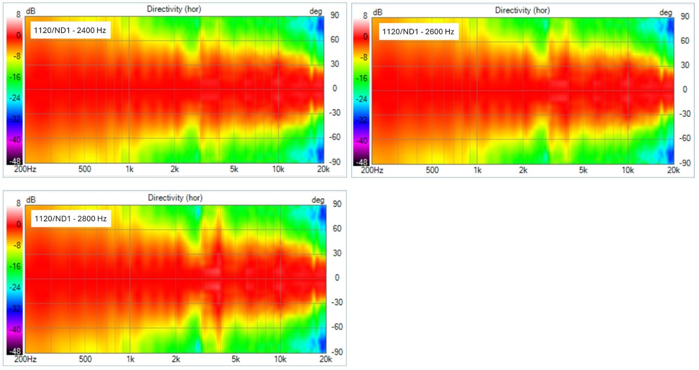 - On voit que la directivité du pavillon est contrôlée à partir de 8/900Hz, elle est constante jusqu'à plus de 10kHz puis directivité croissante ensuite. Difficile d'estimer l'ouverture car le jaune est à -8db plutôt que 6db qui faciliterait la lecture mais à vue de nez on est à environ 90°