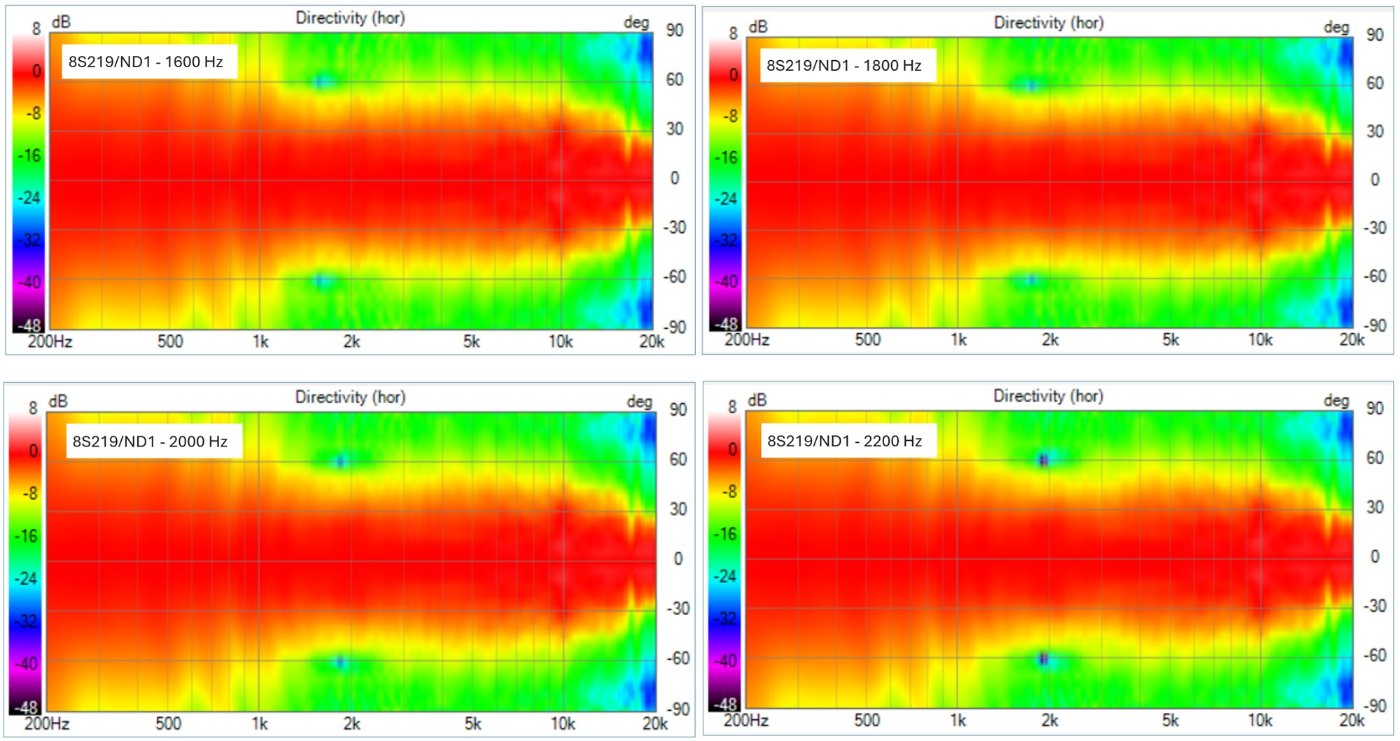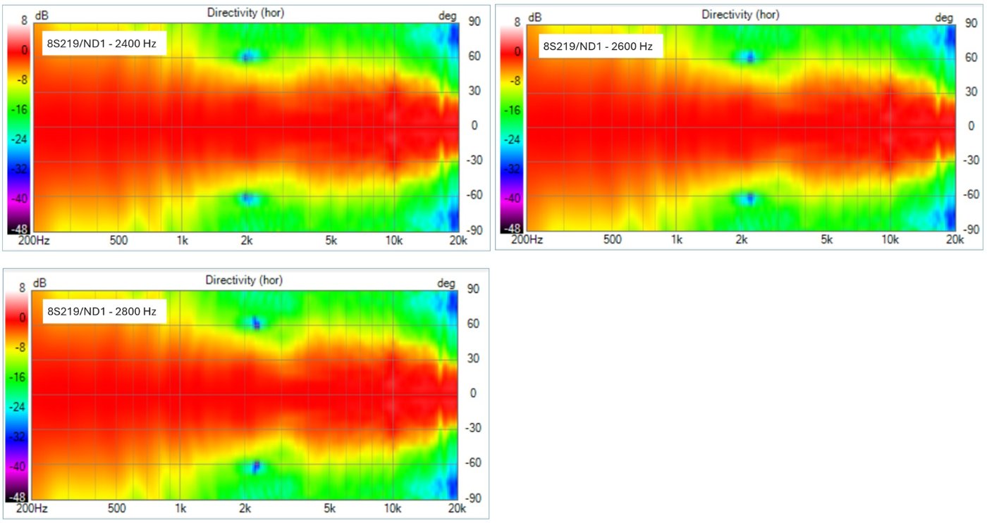 On constate sur ces diagrammes que les deux mids présentent un "plateau" de directivité dans la zone 1kHz-2kHz à peu près, le PHL étant sans surprise un peu moins directif que le 8" BMS.