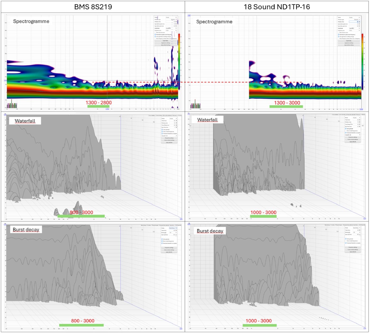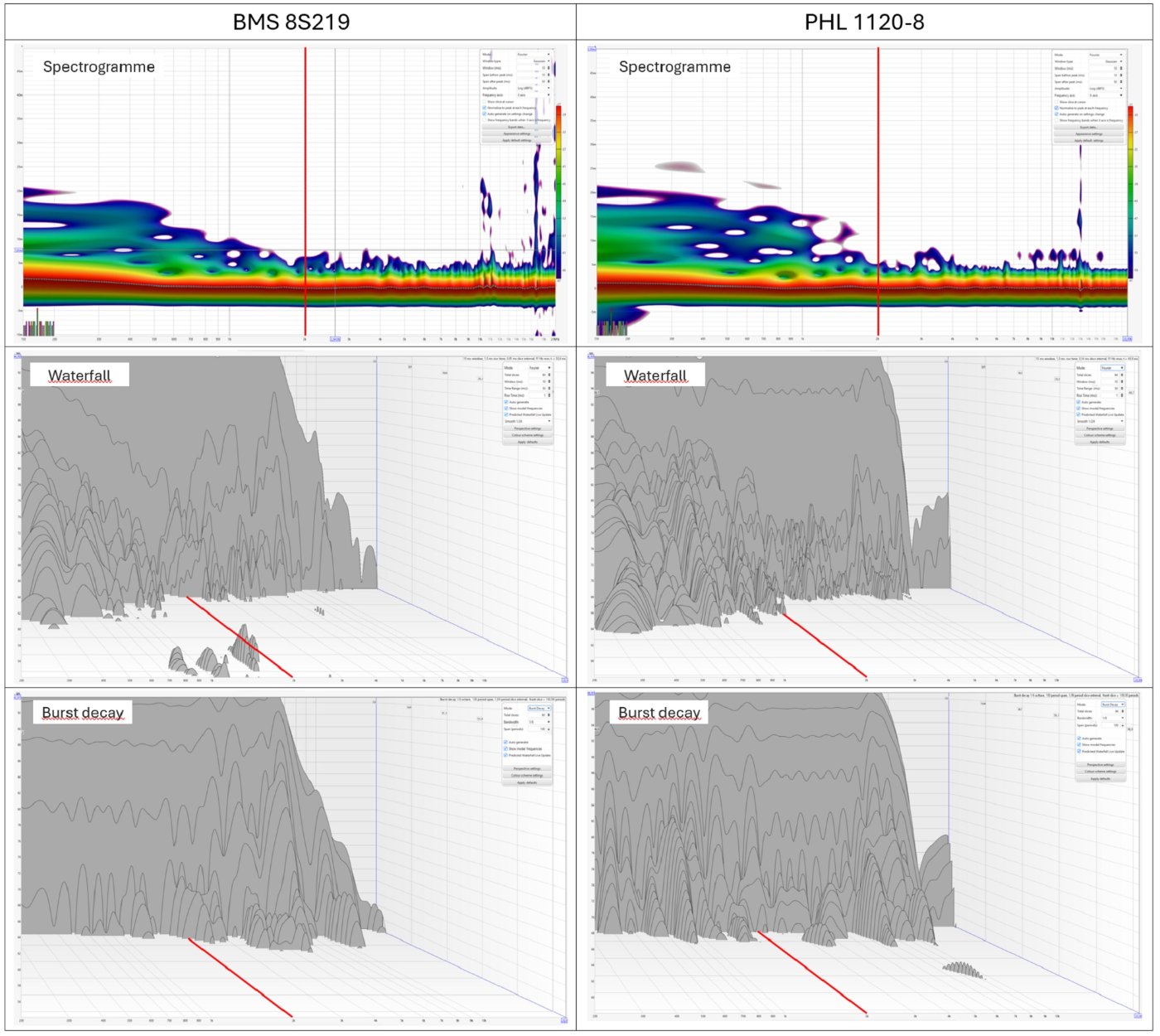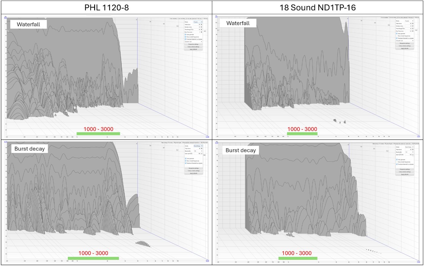 Pour affiner, on peut regarder le comportement temporel des deux HP, ci-dessous leurs waterfall et burst decays après égalisation REW. Paramétrage waterfall : window 10ms, time range 48ms, rise time 1ms.