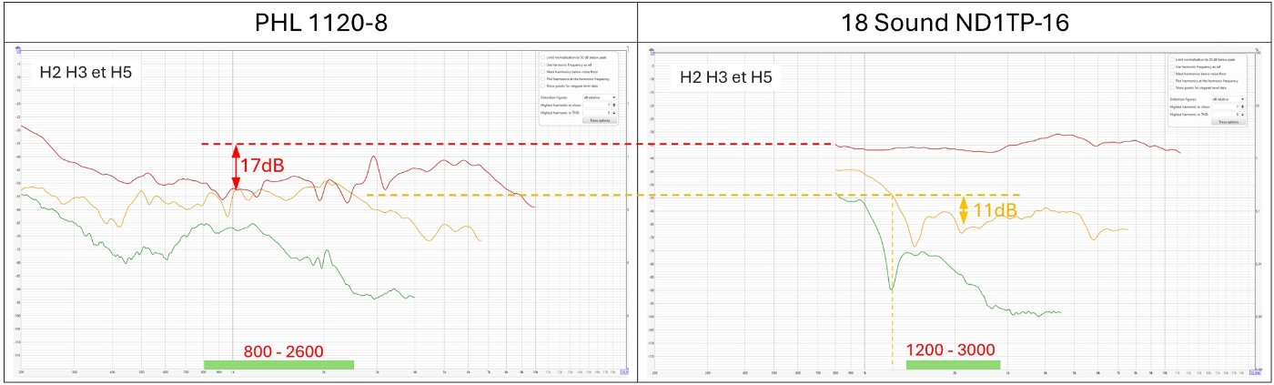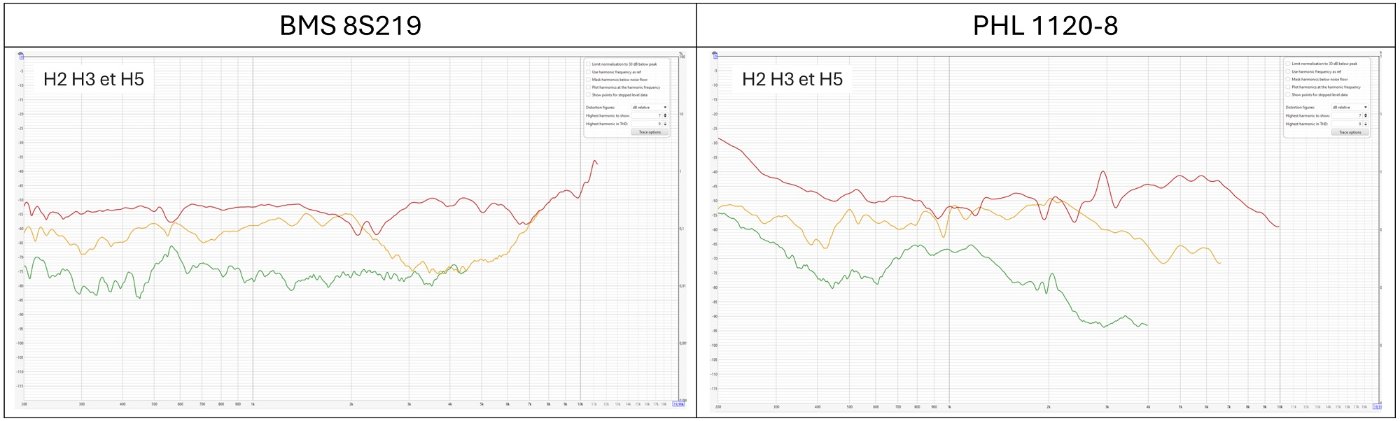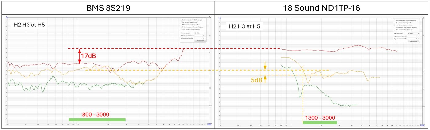 Concernant la distorsion, on voit ci-dessous les graphiques de H2, H3 et H5 des deux HP en dB relatifs. Comme prévu, le 6,5" est nettement meilleur en H2 que la compression, mais nettement moins bon en H3.